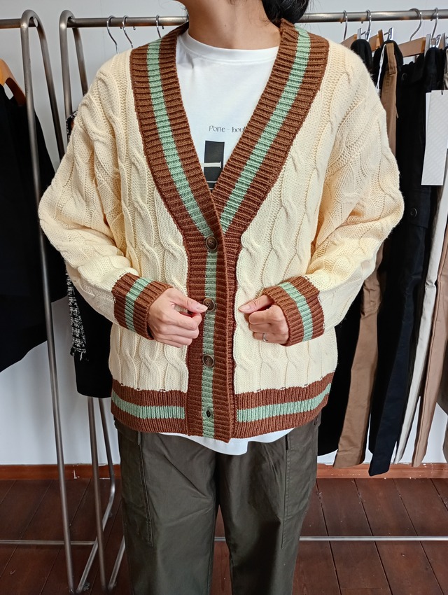 フリーサイズ アクリル86% 毛14% 身幅54 着丈60 裄丈70.5 裾幅48 ■デザイン ケーブル編みが特徴のリブ配色カーディガン。ラインカラーがアクセントとなり、トラッドな印象を引き出します。 ■素材 凹凸感のある大きなケーブルは存在感が出ること間違いなし◎ ウール混のニットなので手触りも抜群です。 ■スタイリング 全体的にゆったりとしたサイズ感なので、中のインナーを選ばず幅広いスタイリングが楽しめます。 ネックが深めで着用しやすく、シャツとの組み合わせもおすすめです。
