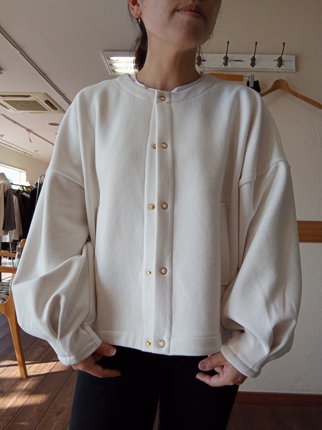 フリーサイズ コットン100% 別布 ポリエステル65% アクリル35% 身幅平置き54 着丈平置き49 手洗い可 モデル身長154 スタンドネックに裾のドロストがカジュアルすぎない着こなしに。着るだけで決まる1枚です。