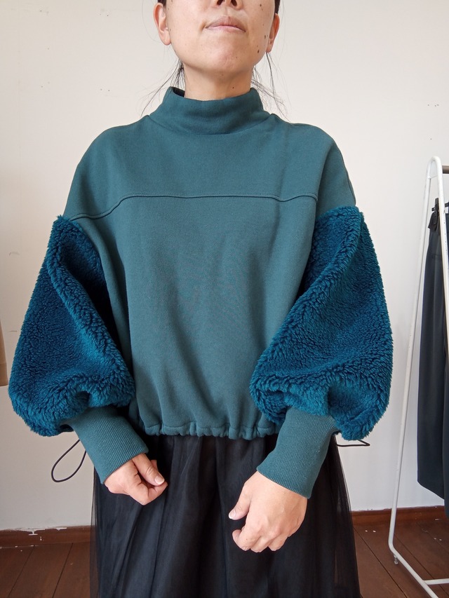 国産裏起毛袖ボア切替プルオーバー ブルー trois