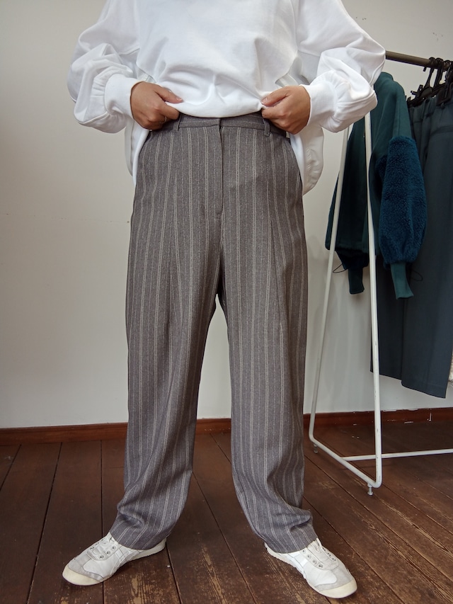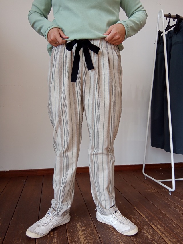 チェック&ストライプテーパードパンツ ベージュストライプ trois