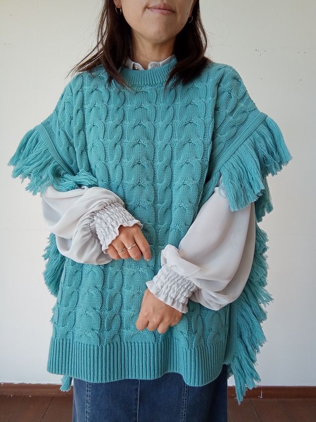 サイズ38 アクリル70% ウール30% 着丈66 バスト118 肩幅58 結構ボリューミーなフリンジが特徴的なニットベストです。丈感もあるので、スキニーパンツ×ロングブーツコーデにもピッタリですね。