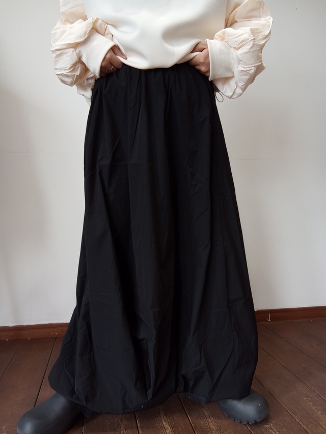 フリーサイズ ポリエステル100% ウエスト平置き34(うしろゴム) 着丈平置き94 モデル身長154 程よく効いたストレッチ素材に、撥水加工を施したツイルスカート。前後にタックの入ったデザインと程よいフレアが特徴の大人のスカートです。
