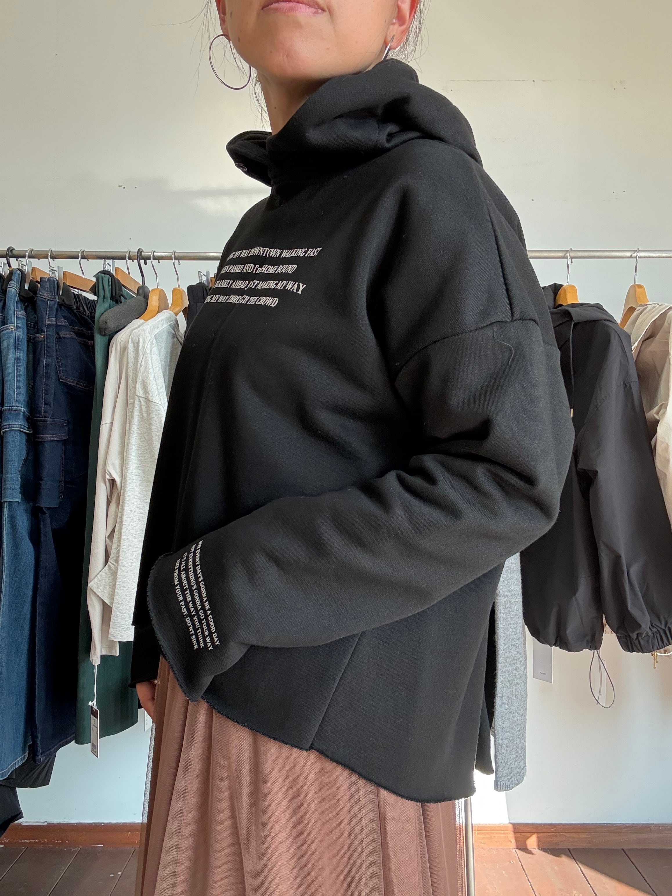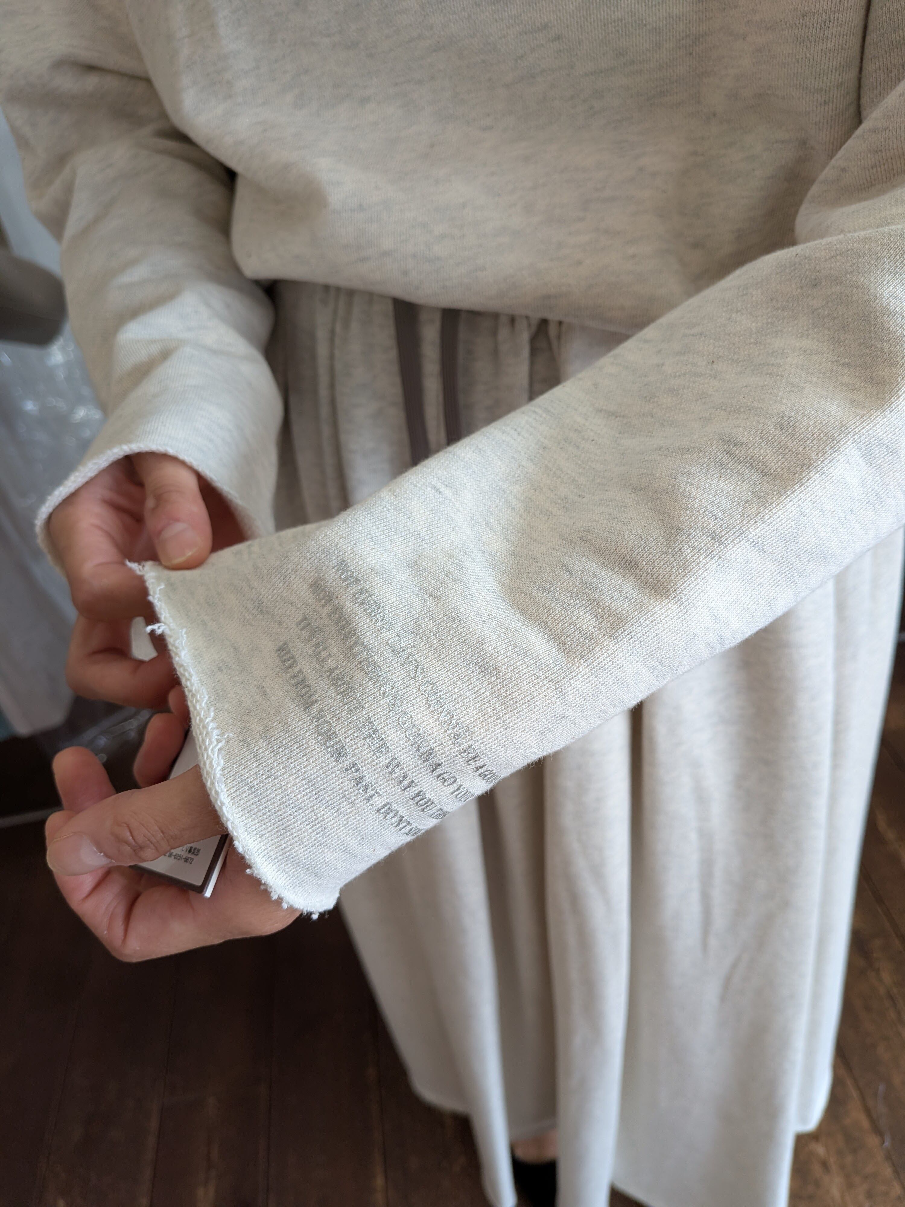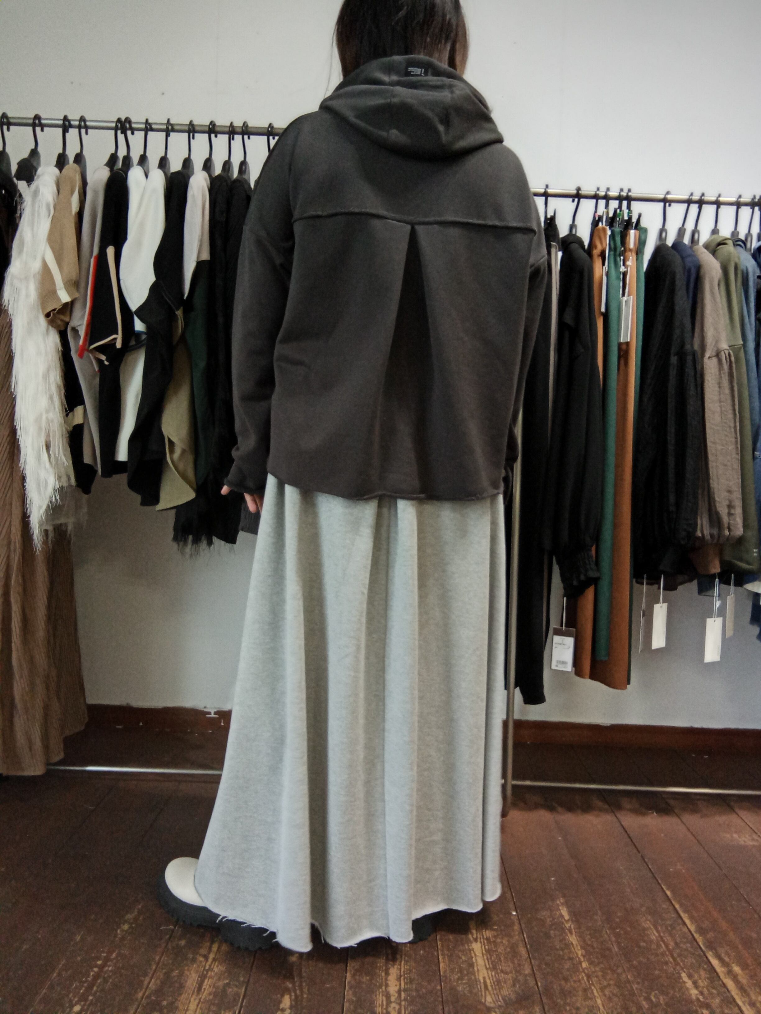 裏毛といっても多種多様な素材がある中で、ayaneは軽量であることを重視しています。軽量でありながらも裏毛のもつカジュアルでスポーティーな印象はしっかり有しているので大人が着る裏毛としておすすめいたします。裏毛ロングスカートとのセットアップもおすすめです。