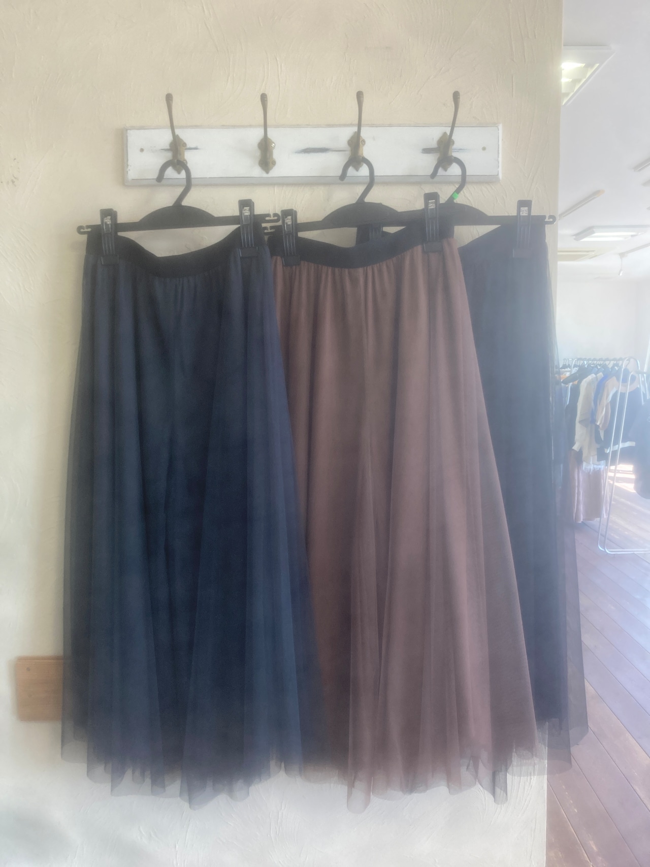 柔らかくふんわりとしたチュールを2枚重ねにすることで、奥行きのあるニュアンスと透けすぎな い安心感を両立し、裏地付きで一枚でも安心の仕様です。