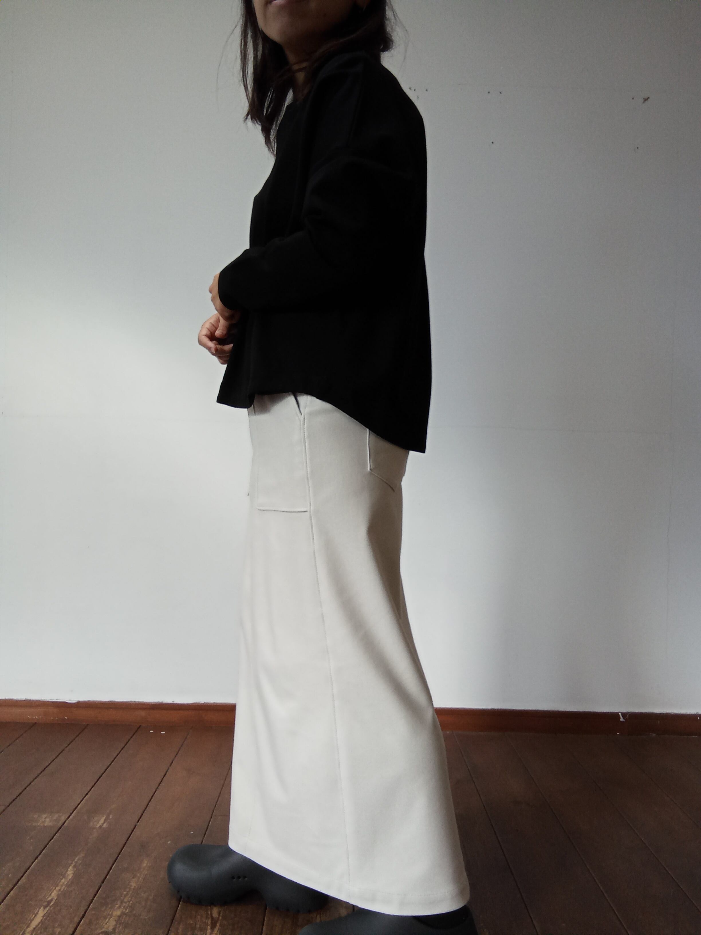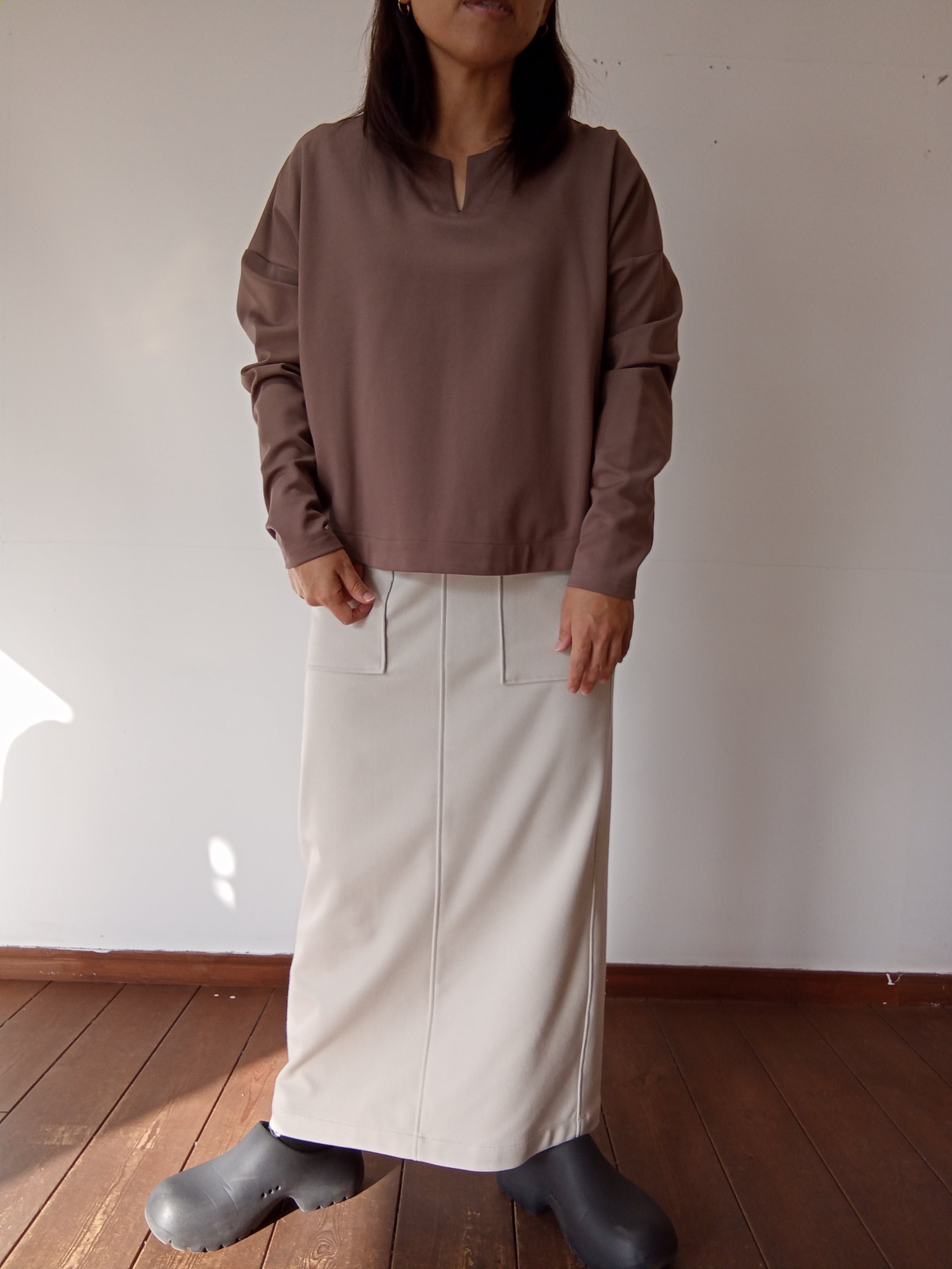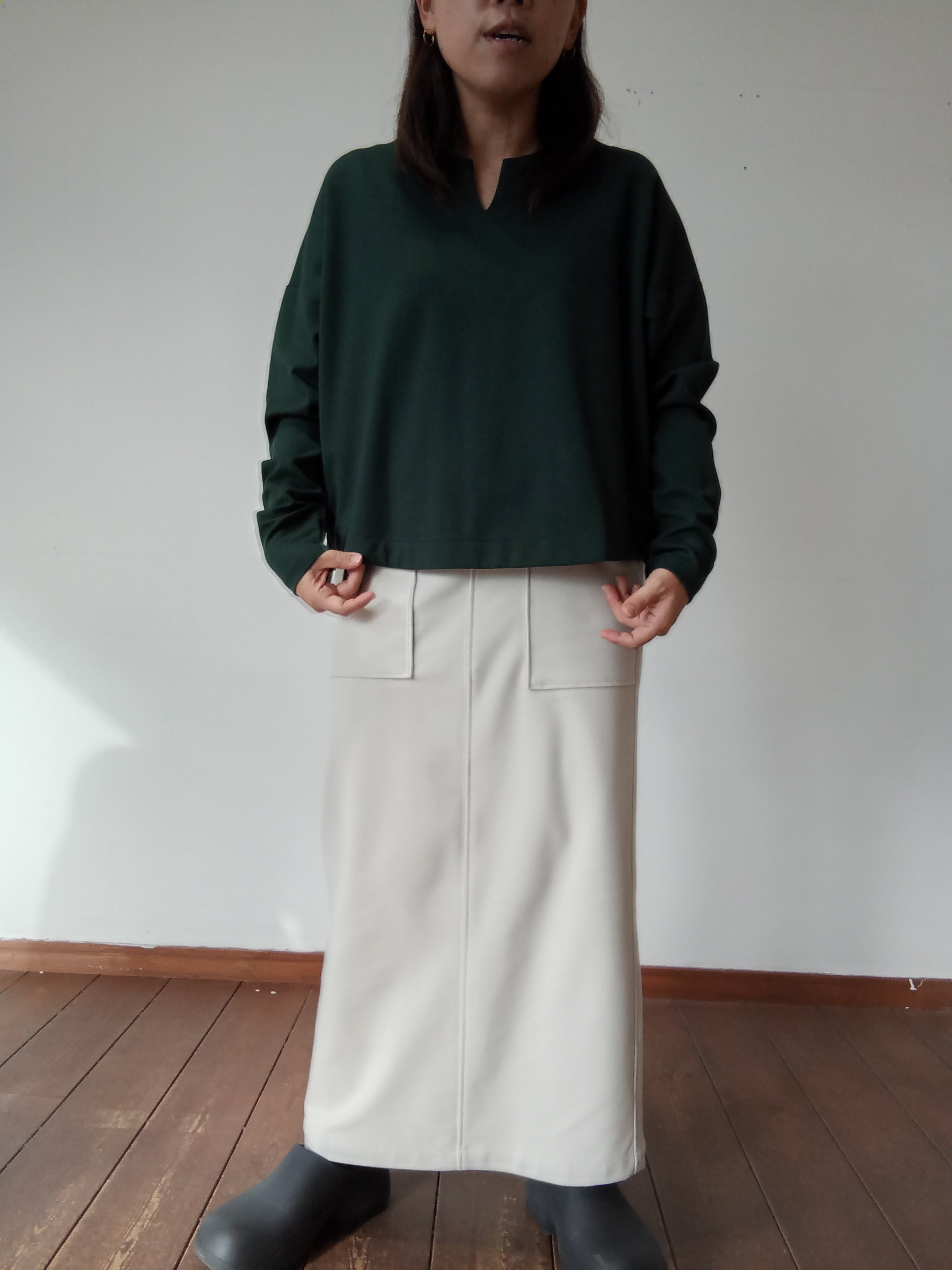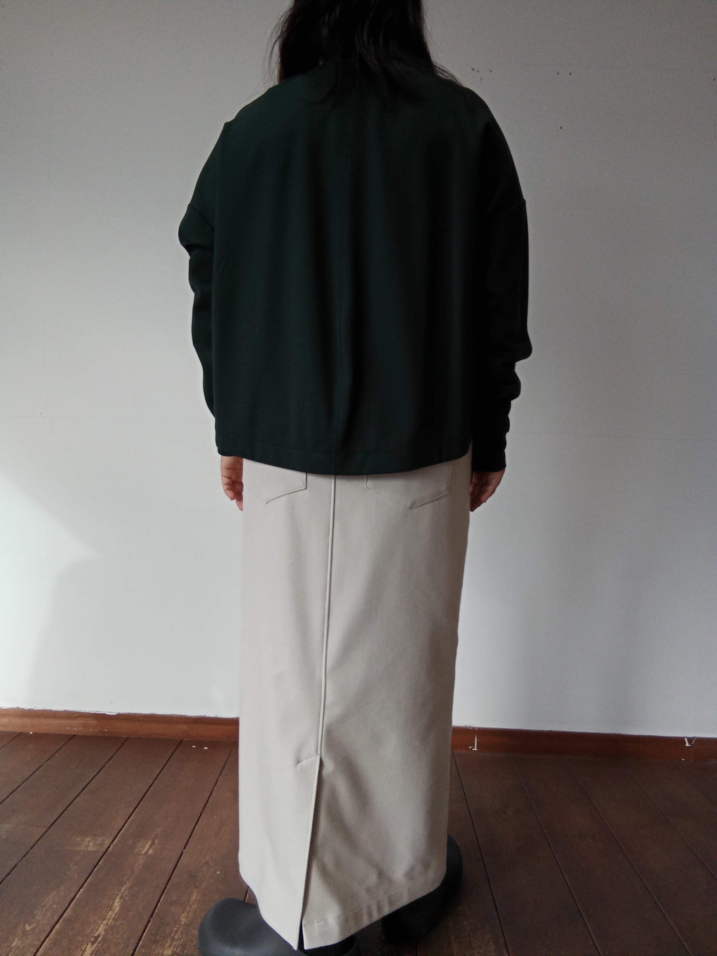 ポンチ素材とはいわゆるダブルジャージー素材のこと。裏と表を同時に編んで仕立てられた素材です。厚すぎず薄すぎず長い季節活躍してくれます。デザイン的にはキーネックのシンプルなプルオーバーでTシャツ以上トレーナー未満。キレイめなカジュアルコーデにおすすめです。