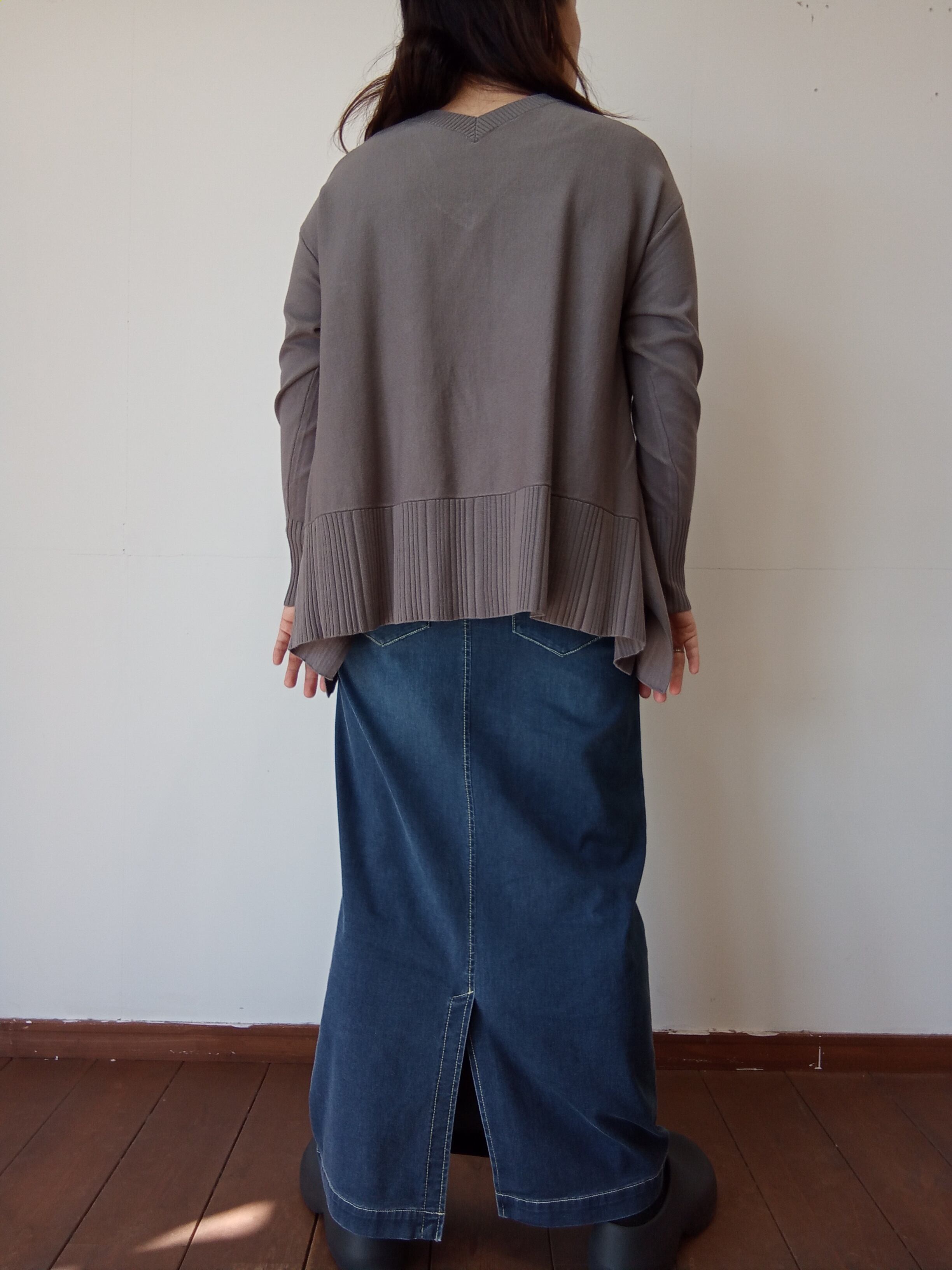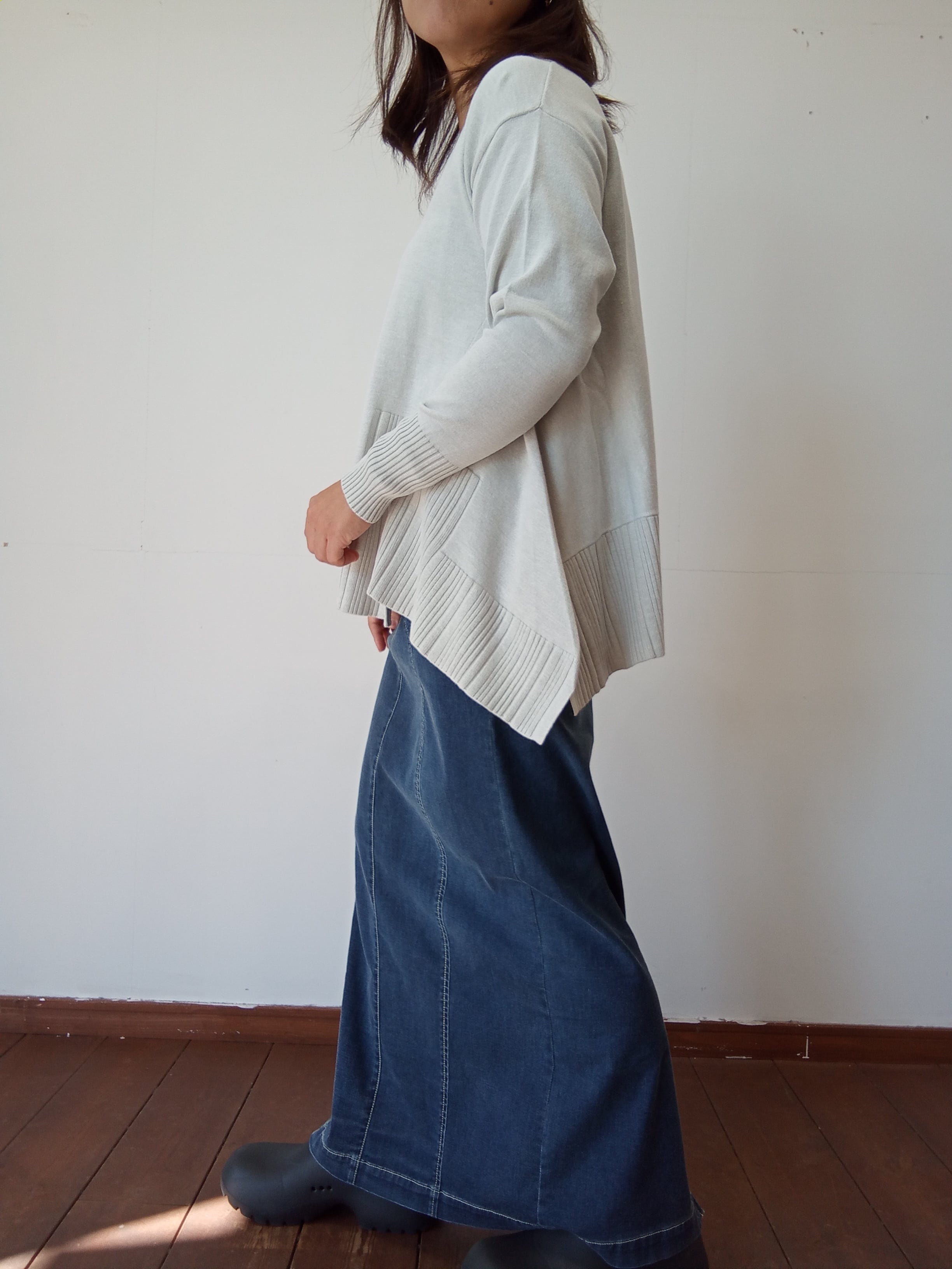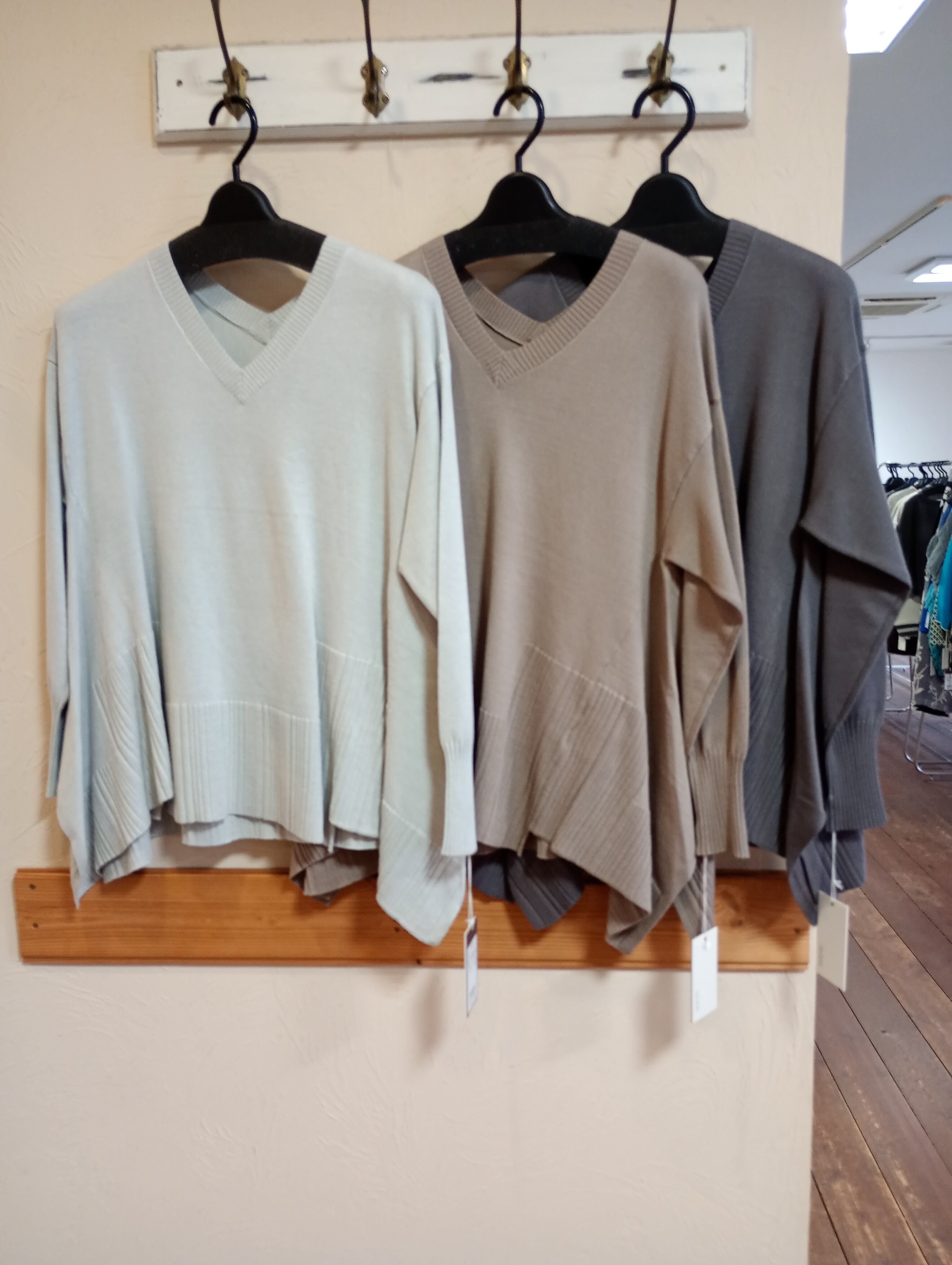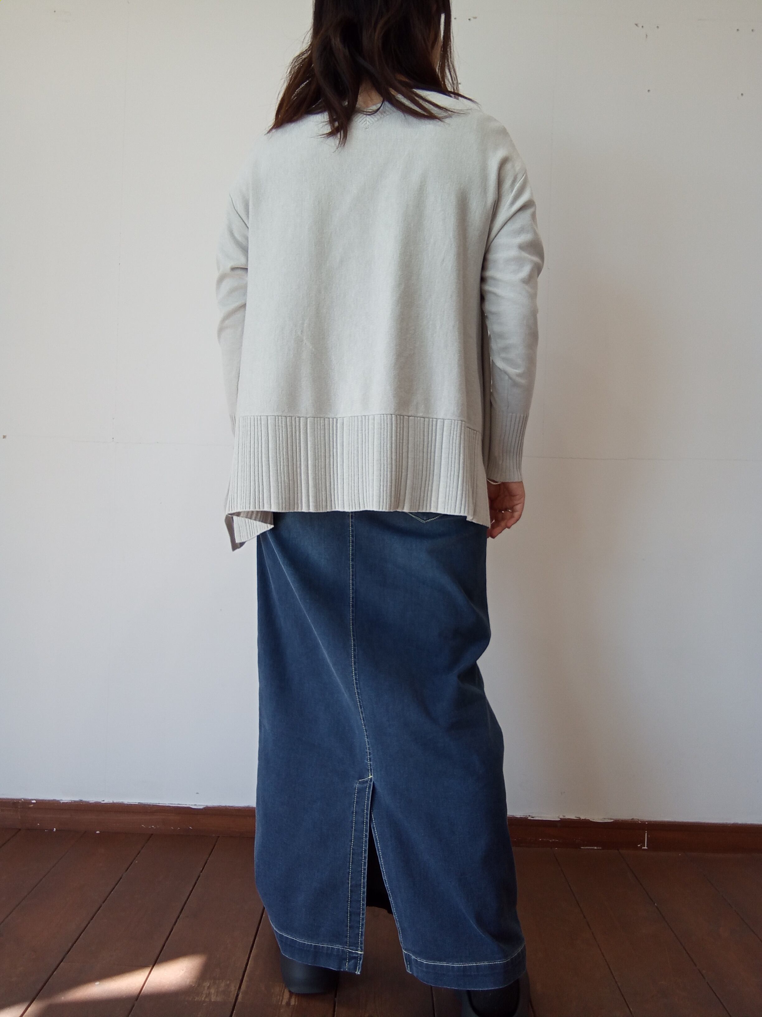 イレギュラーな裾のディテールが非常に大人可愛いニットです。落ち感のある素材なので、ゆったりしたサイズ感ですが膨らまない安心感があります。肌触りもよく幅広い年代におすすめできます。