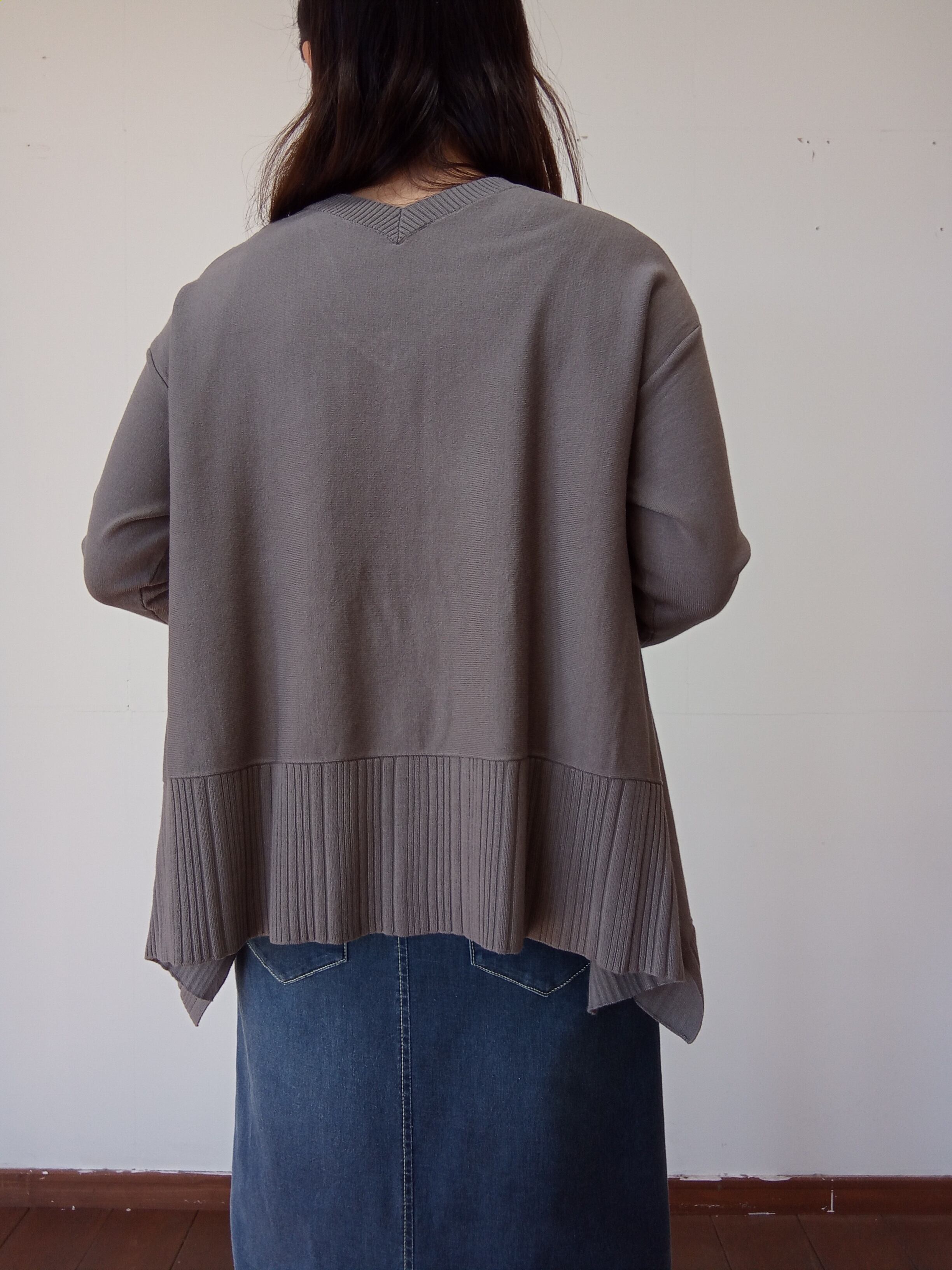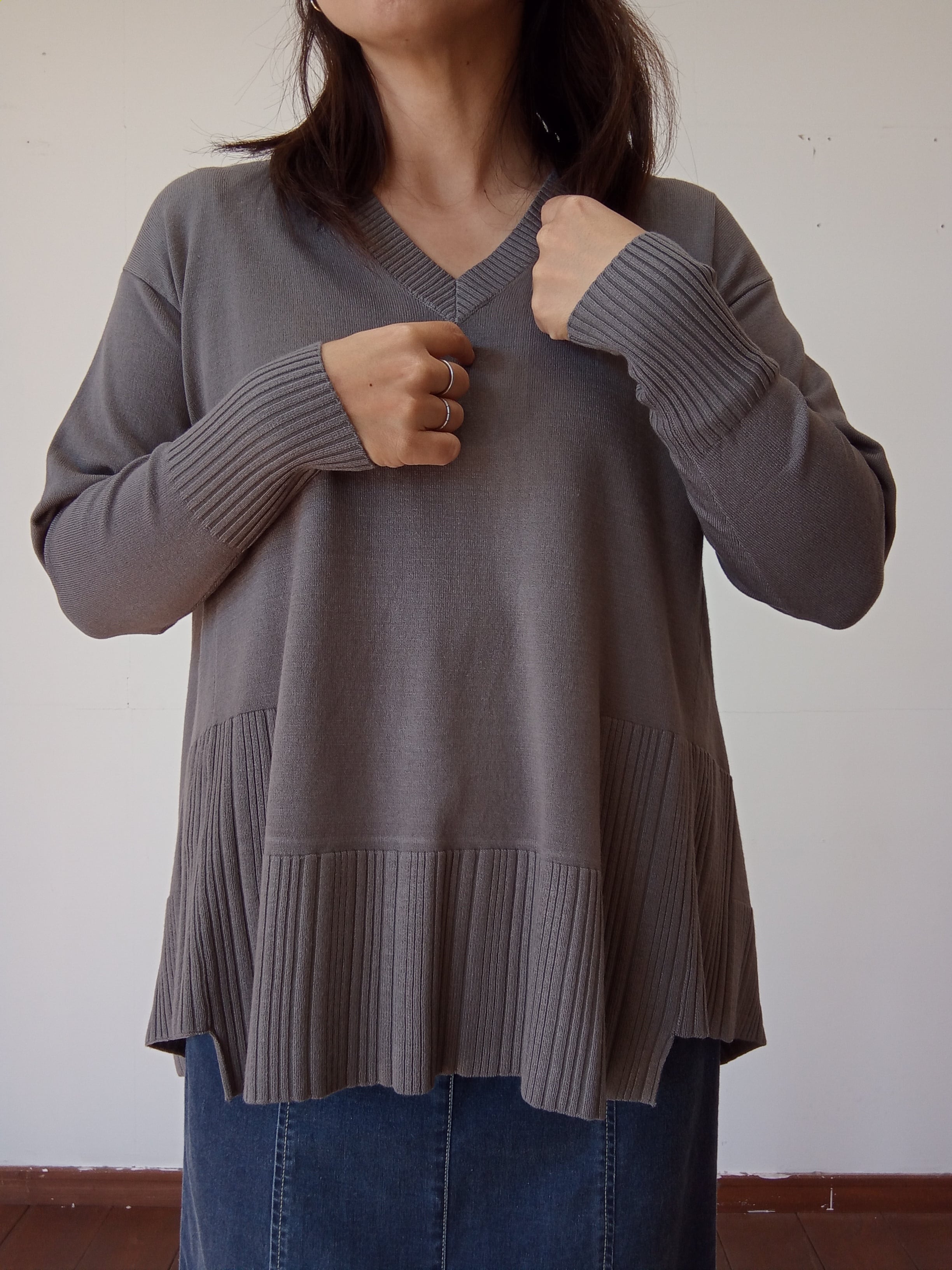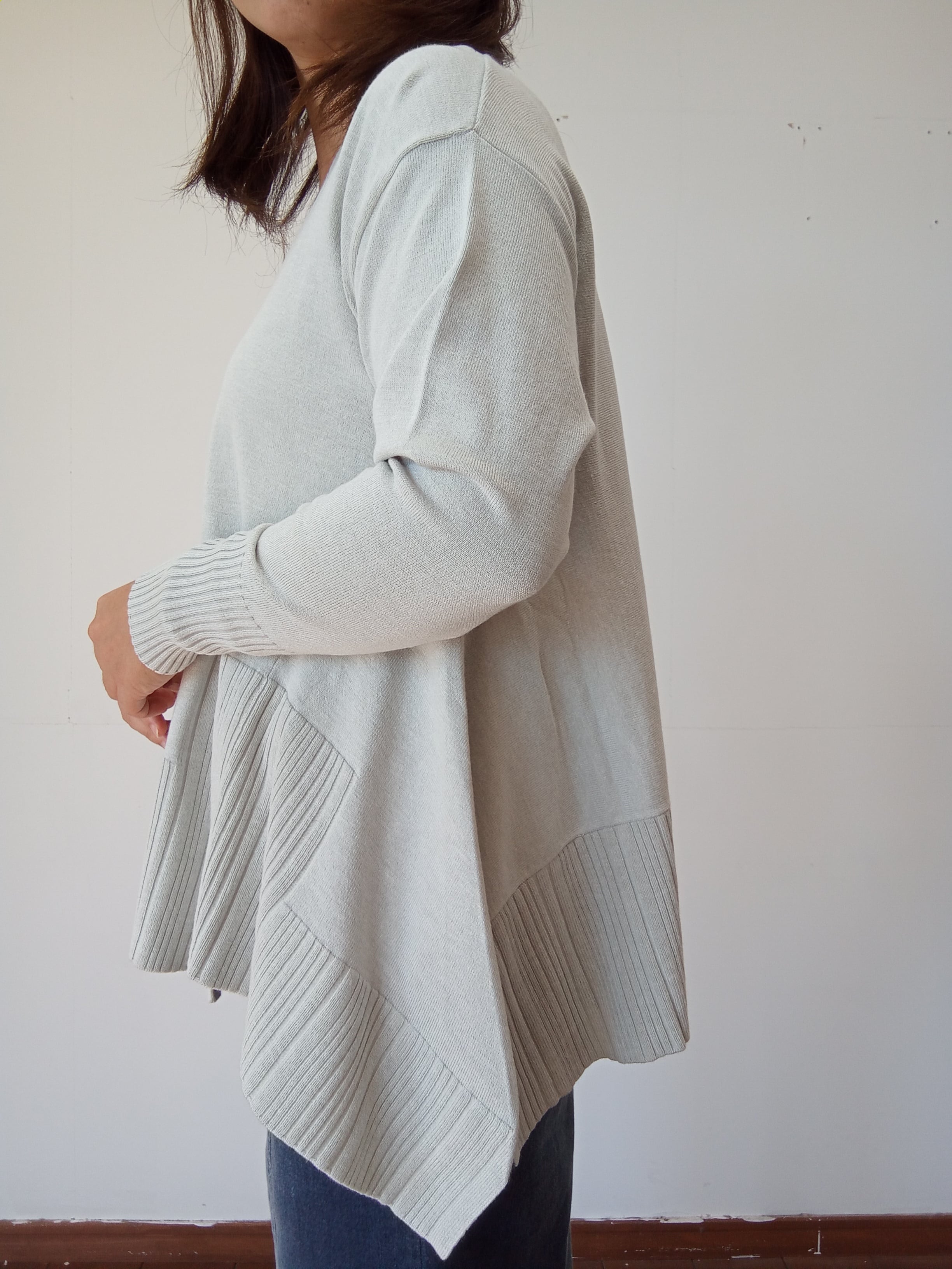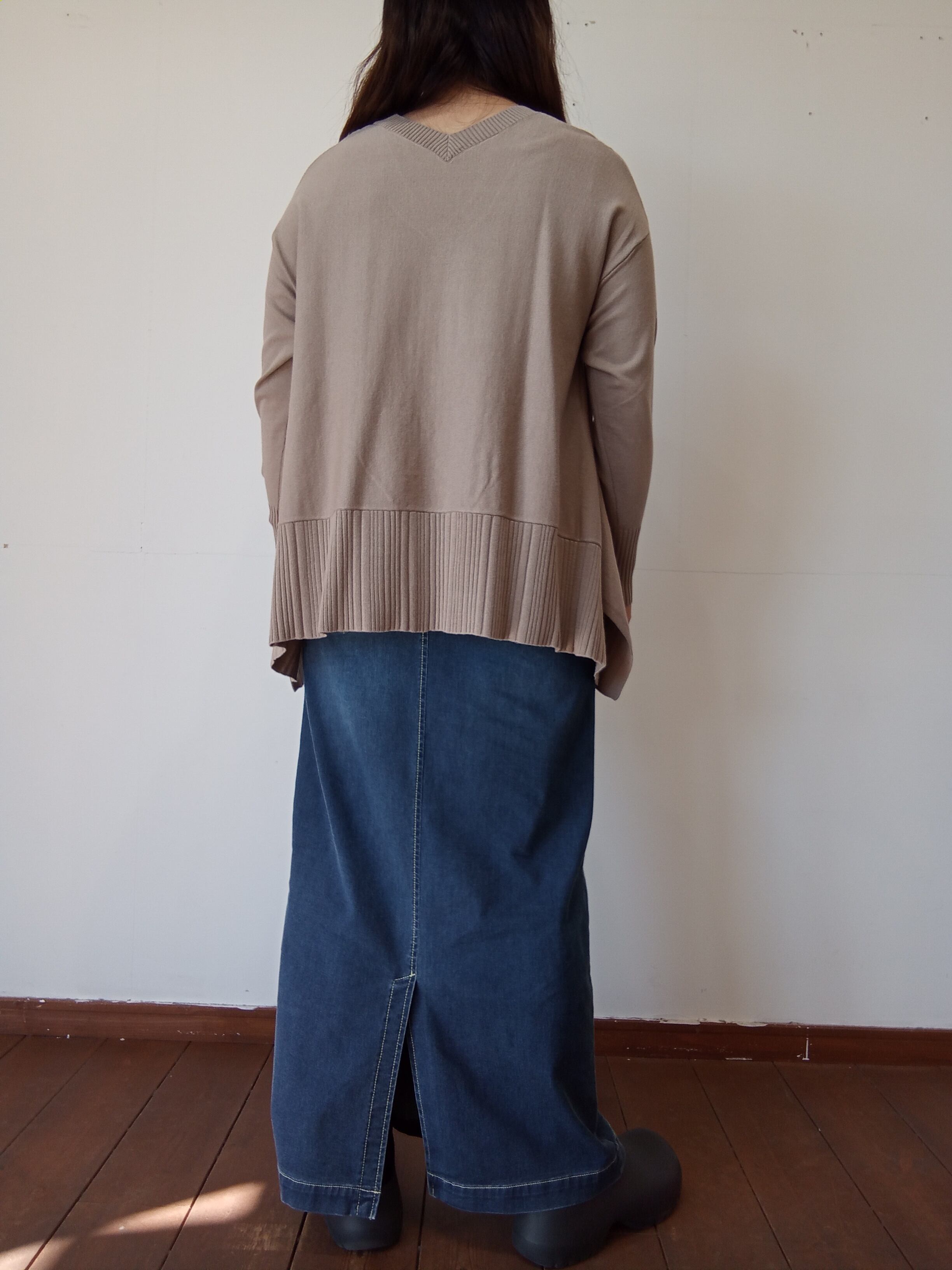 イレギュラーな裾のディテールが非常に大人可愛いニットです。落ち感のある素材なので、ゆったりしたサイズ感ですが膨らまない安心感があります。肌触りもよく幅広い年代におすすめできます。
