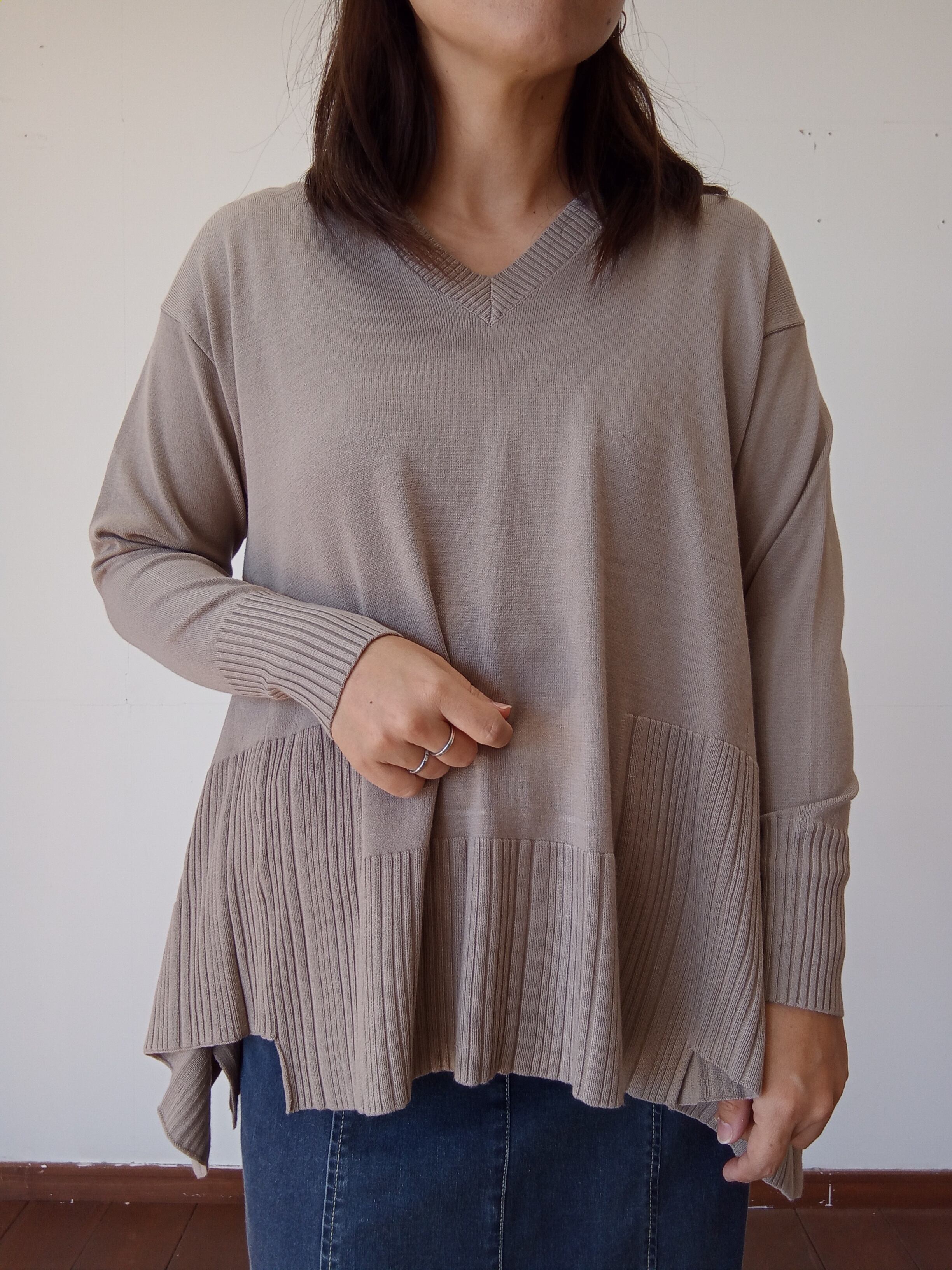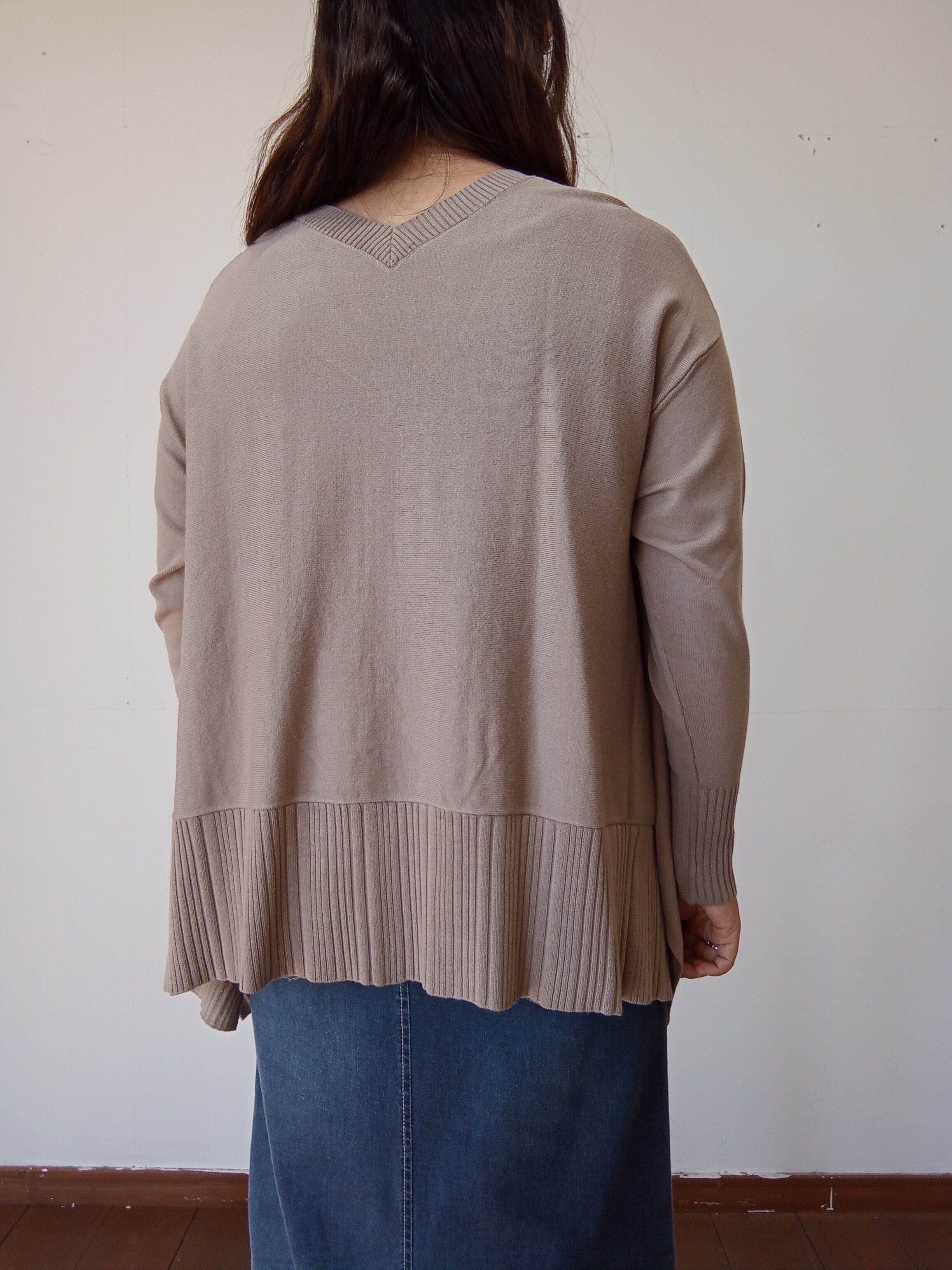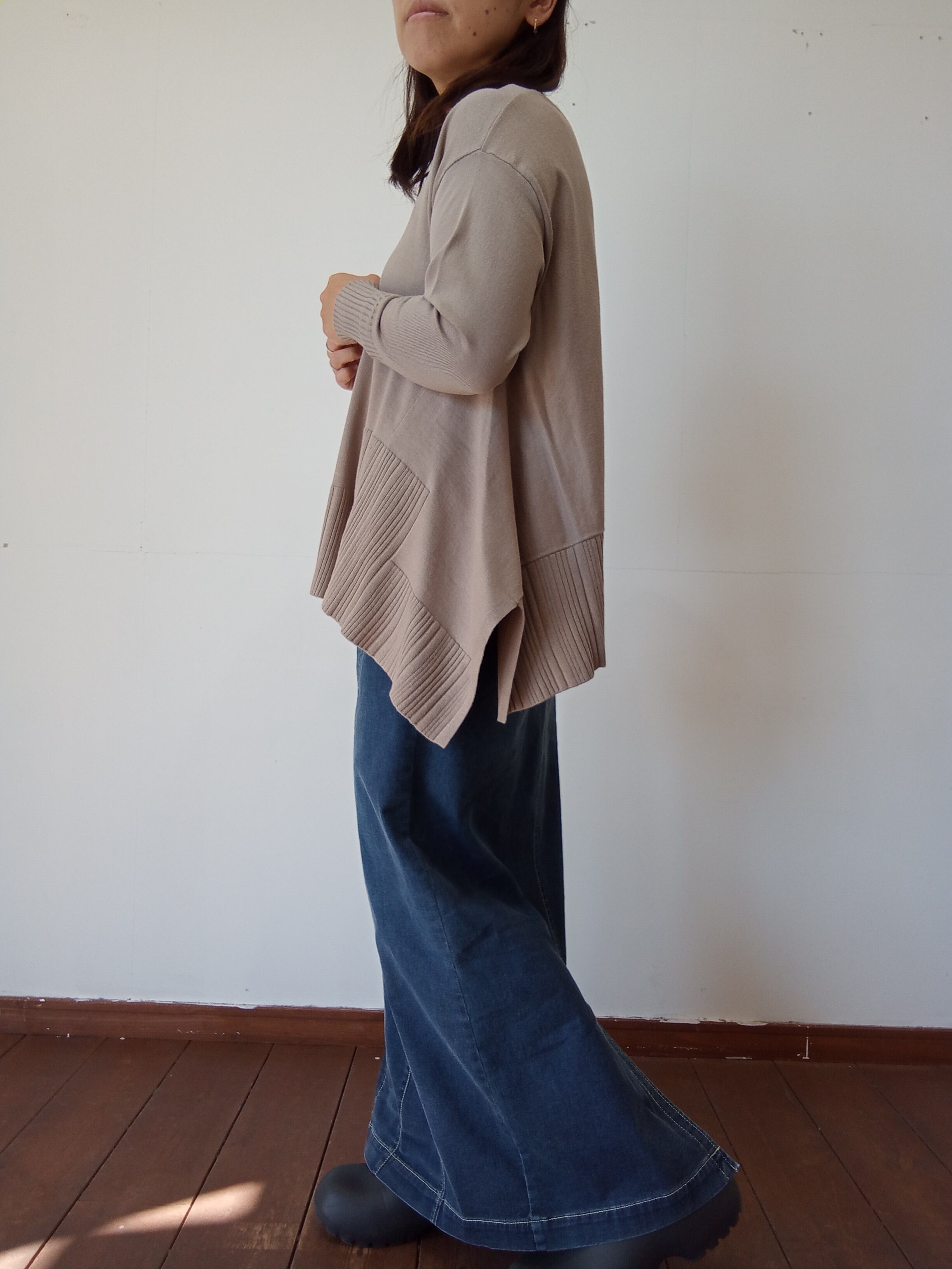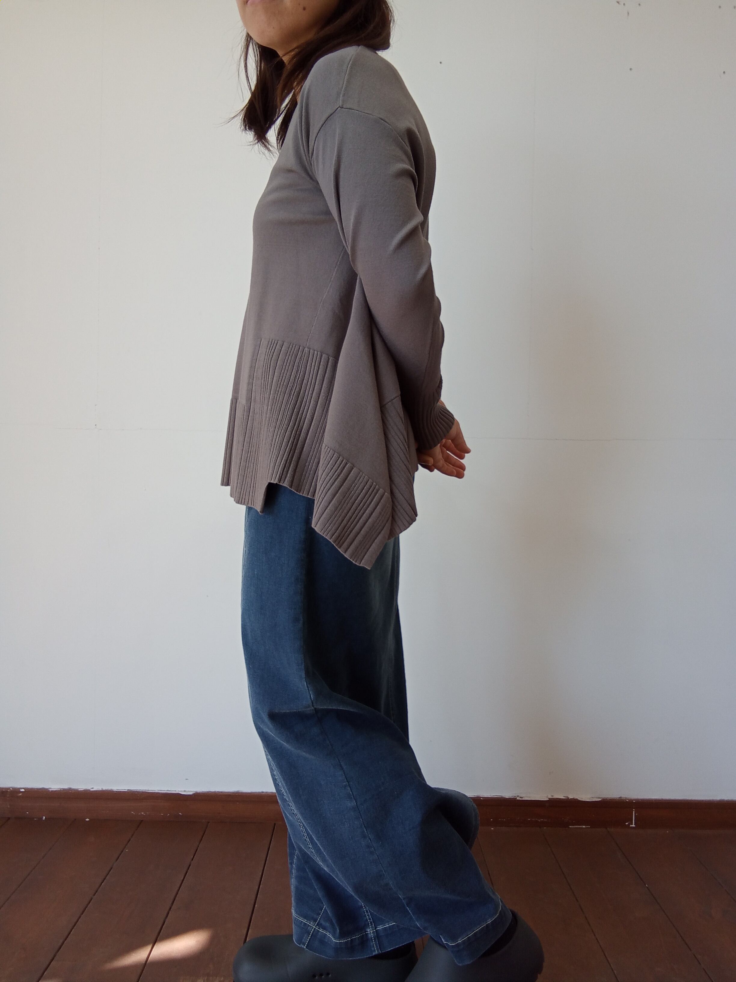 イレギュラーな裾のディテールが非常に大人可愛いニットです。落ち感のある素材なので、ゆったりしたサイズ感ですが膨らまない安心感があります。肌触りもよく幅広い年代におすすめできます。