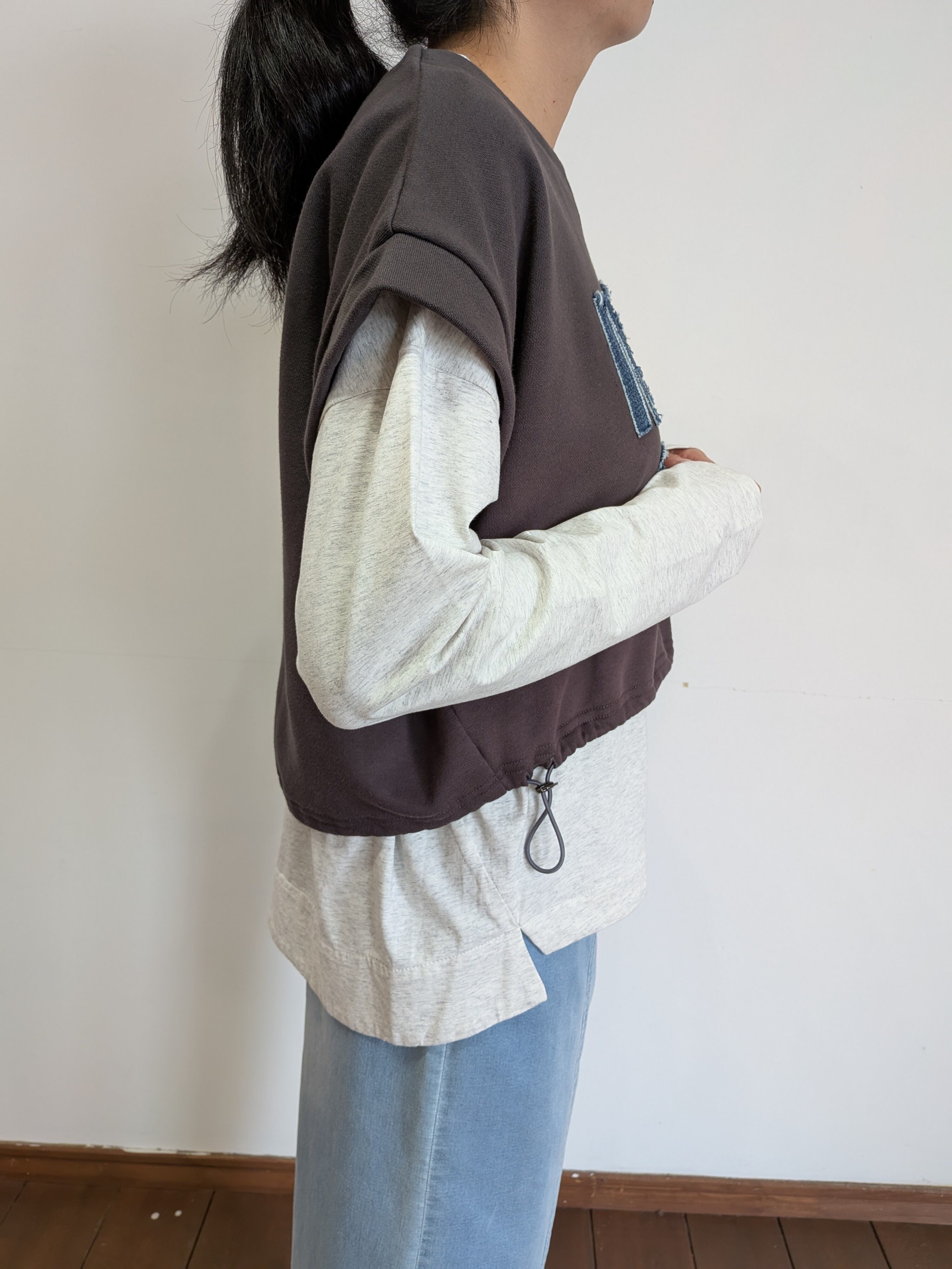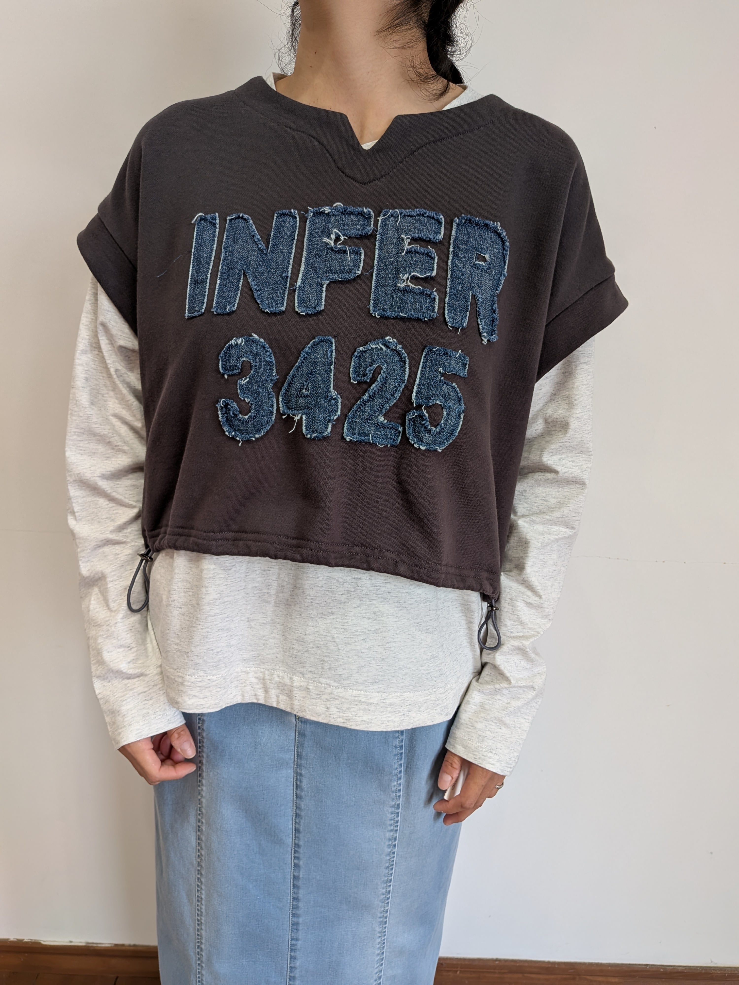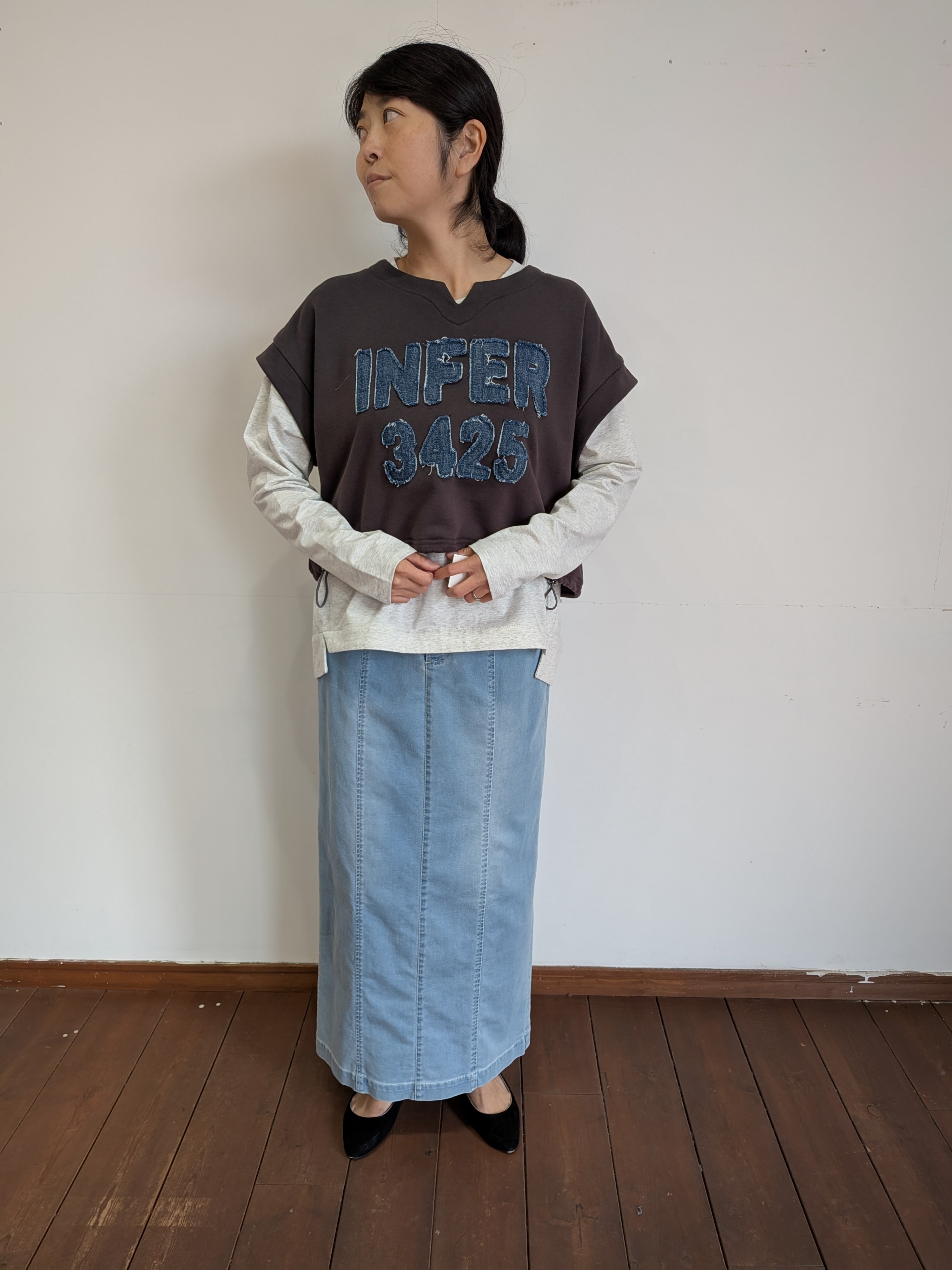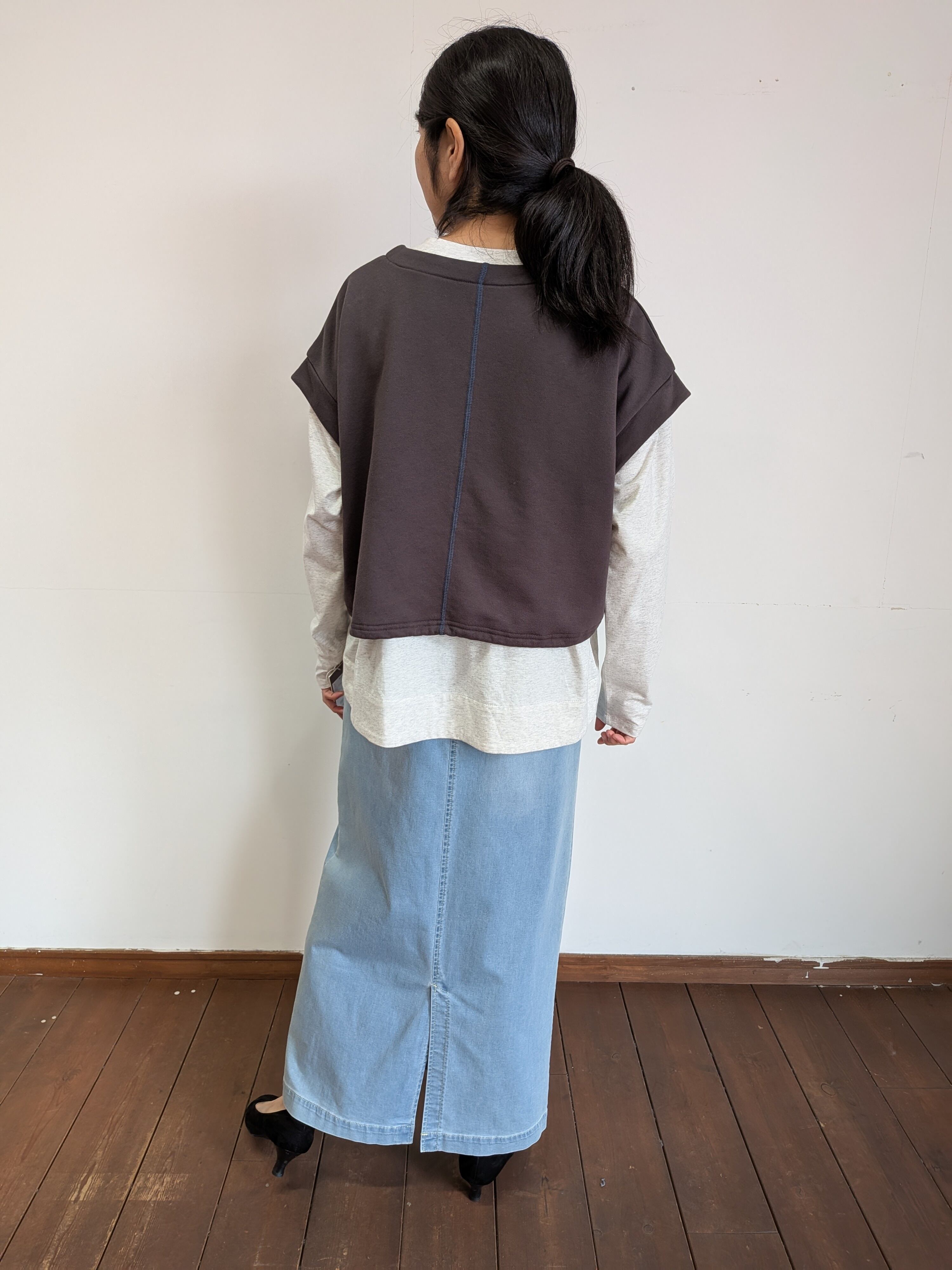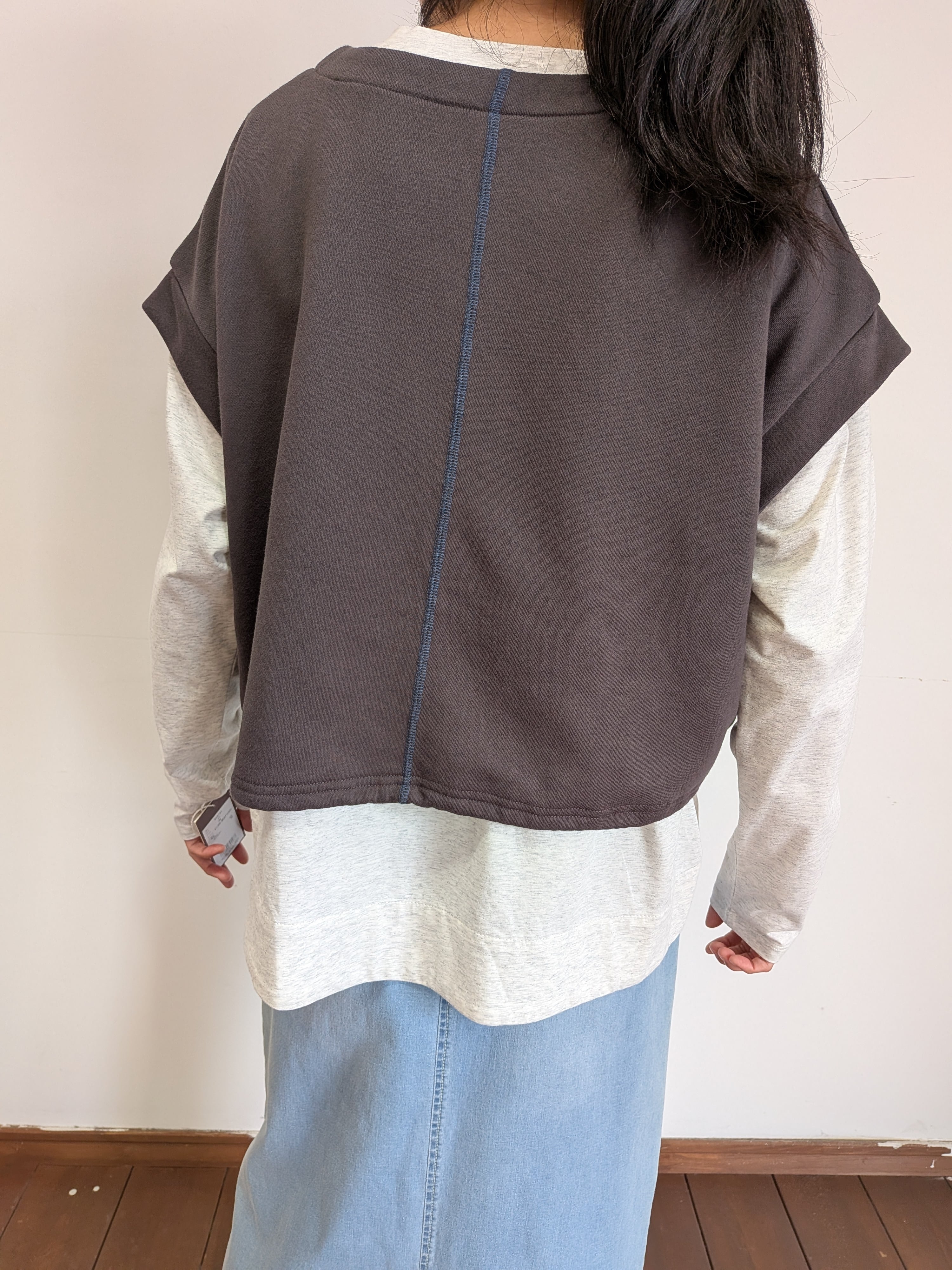 軽量な裏毛を使用したショート丈プルオーバーです。1枚で着るというよりもベスト感覚でレイヤードしていただくアイテムですね。襟ぐりをキーネックにデザインしてあるので、大き目なバストの方にもおすすめです。