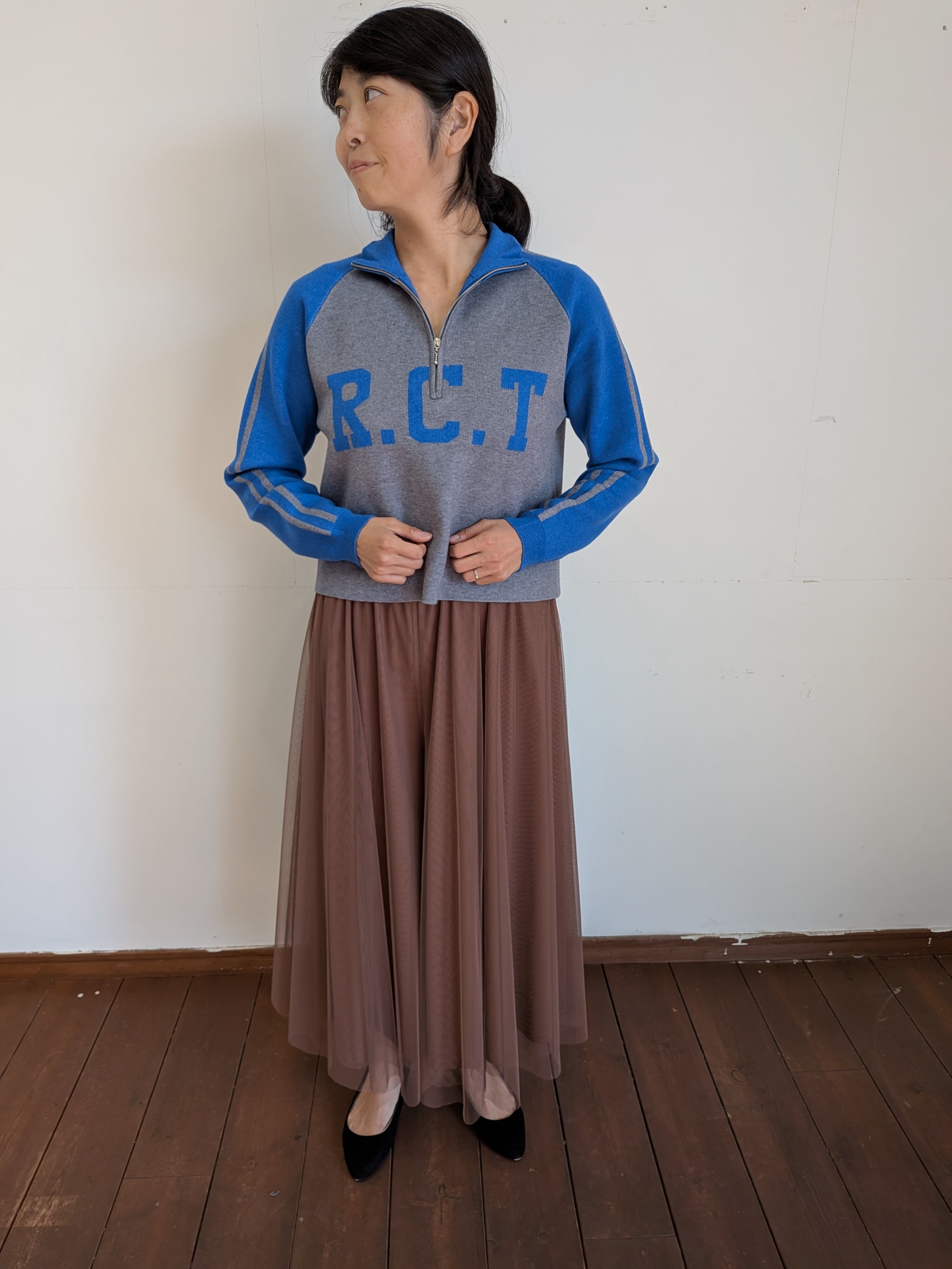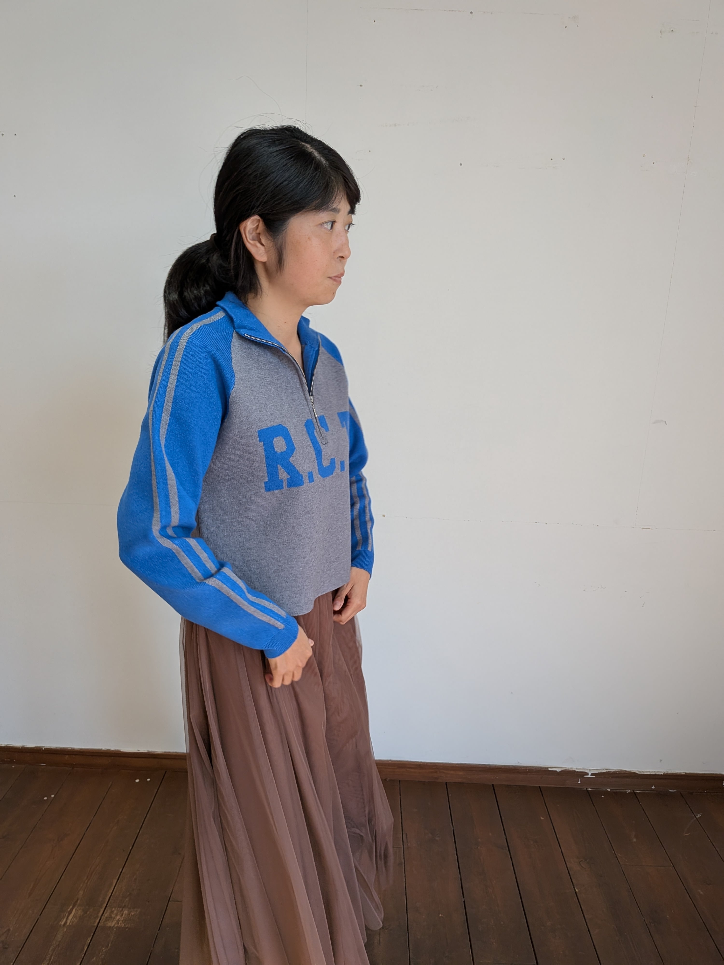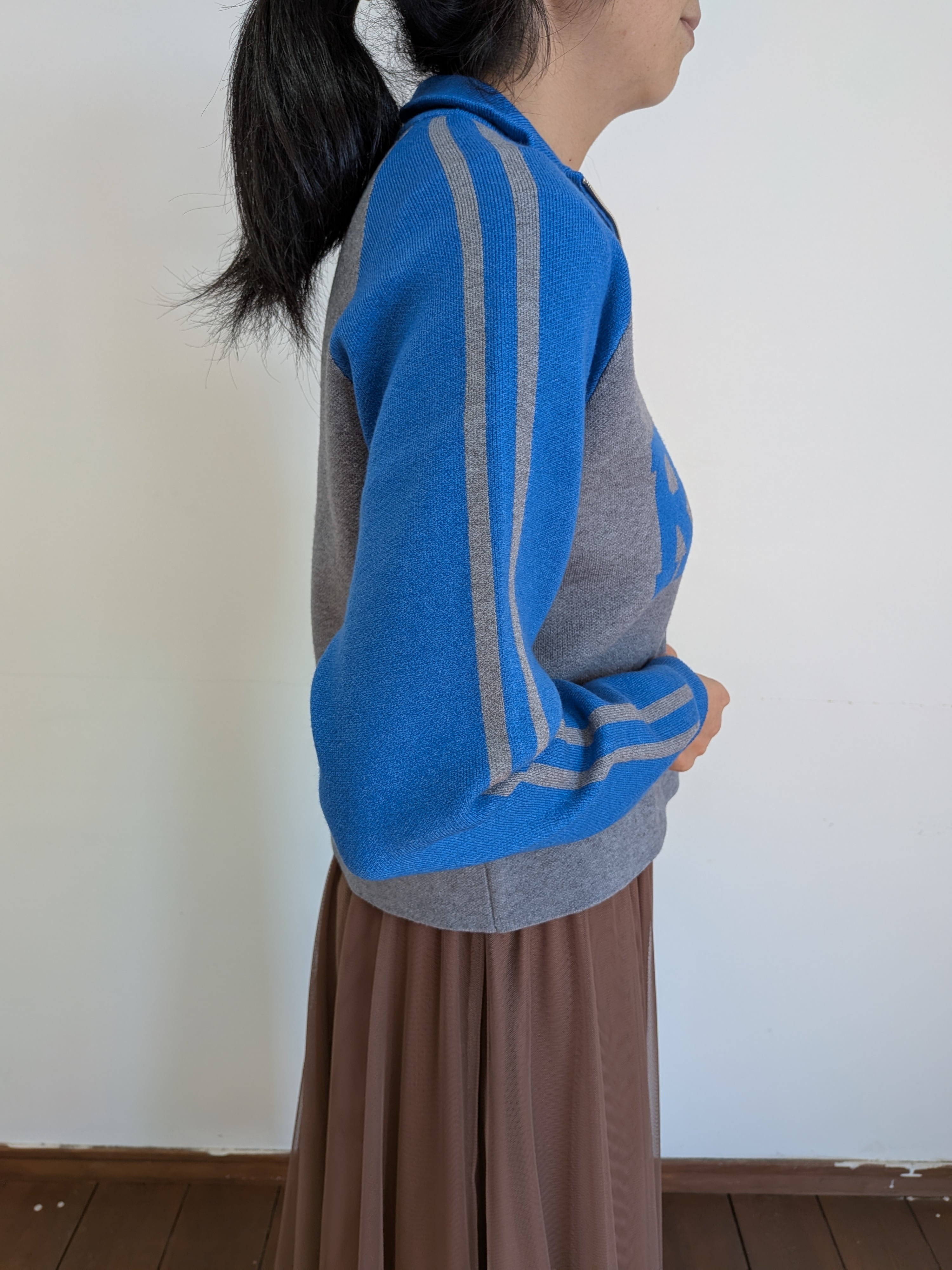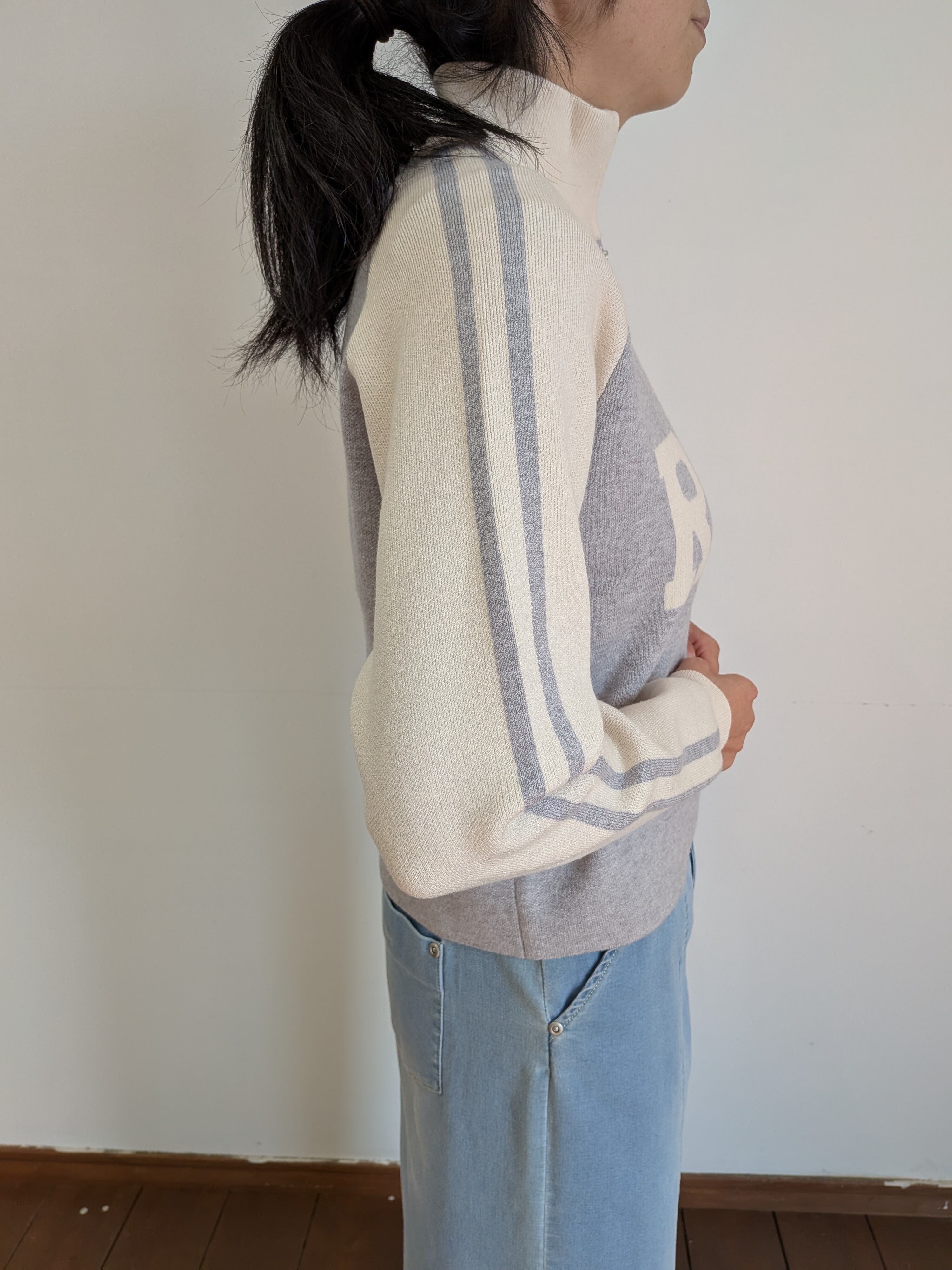 スポーティー感MAXのキャッチーなロゴニットです。肌触りもよく、モチっとした感じのする感触でジャンパースカートなどの上から重ねても可愛いですね。(限定数量)