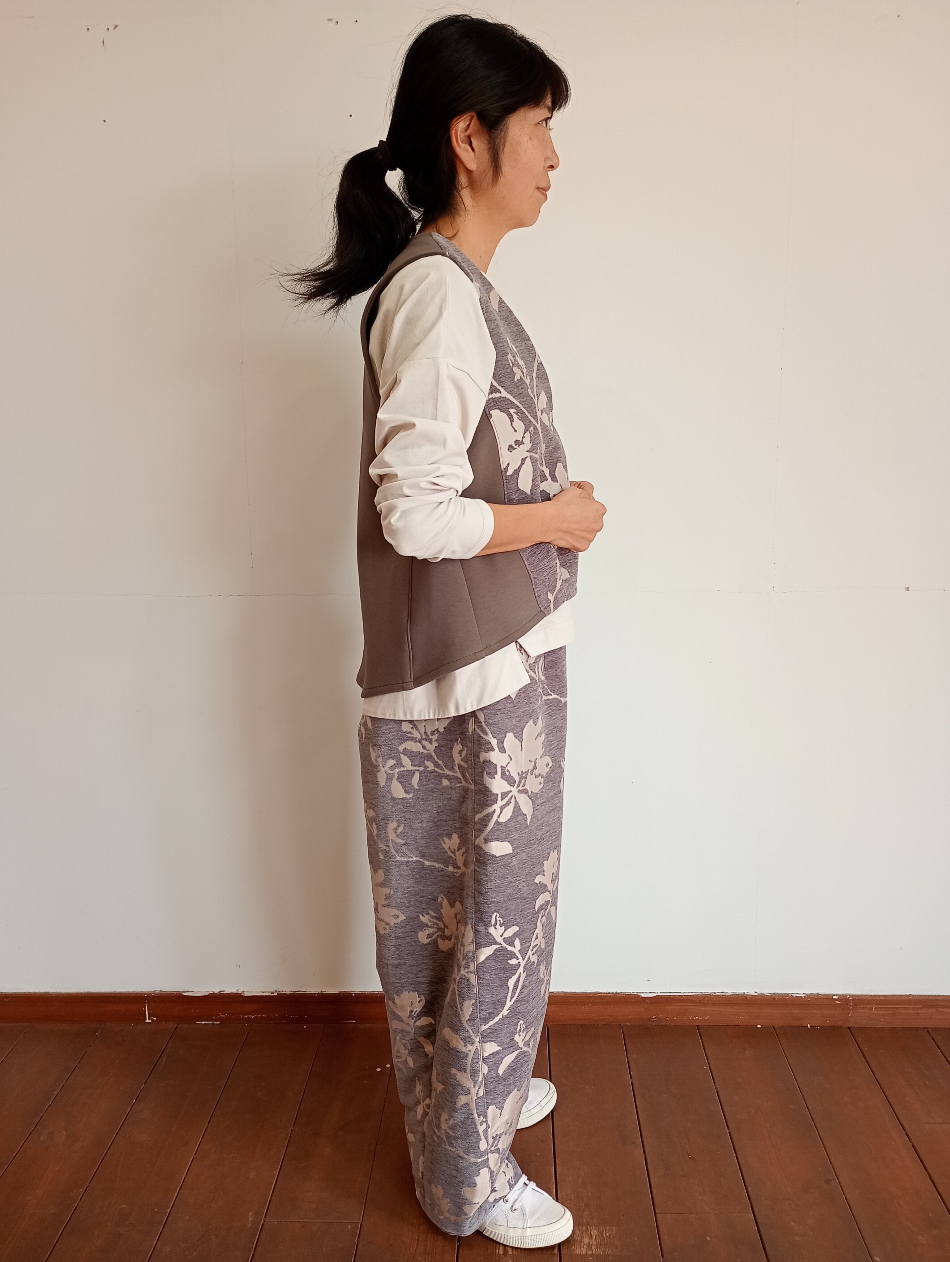 高級感あるスウェード調の花柄ジャガードです。立体感のあるシルエットが綺麗に保たれバレル型の可愛らしさが十分に表現できたパンツです。【花柄ジャガードVネックベスト】とのセットアップもおすすめです。