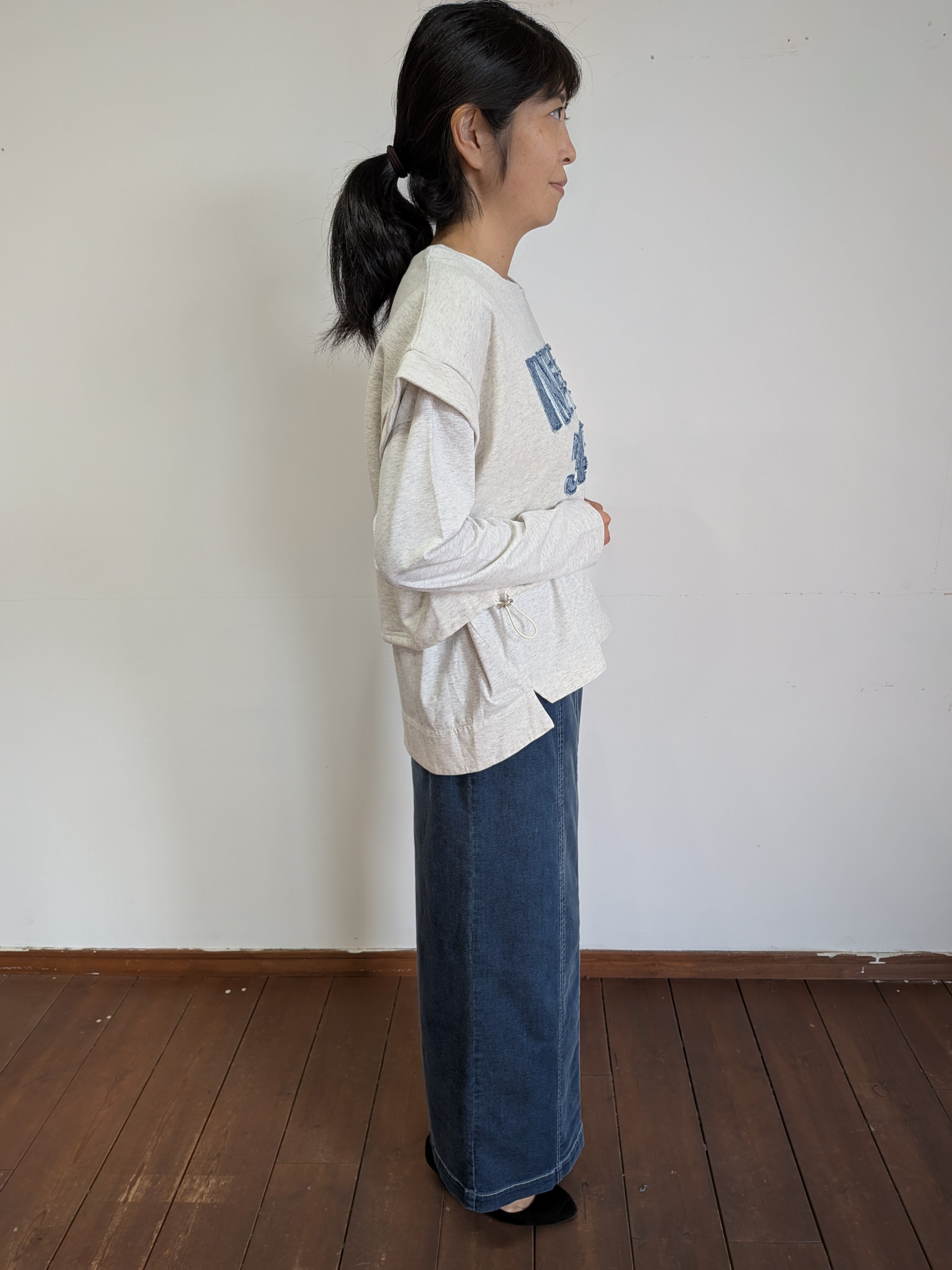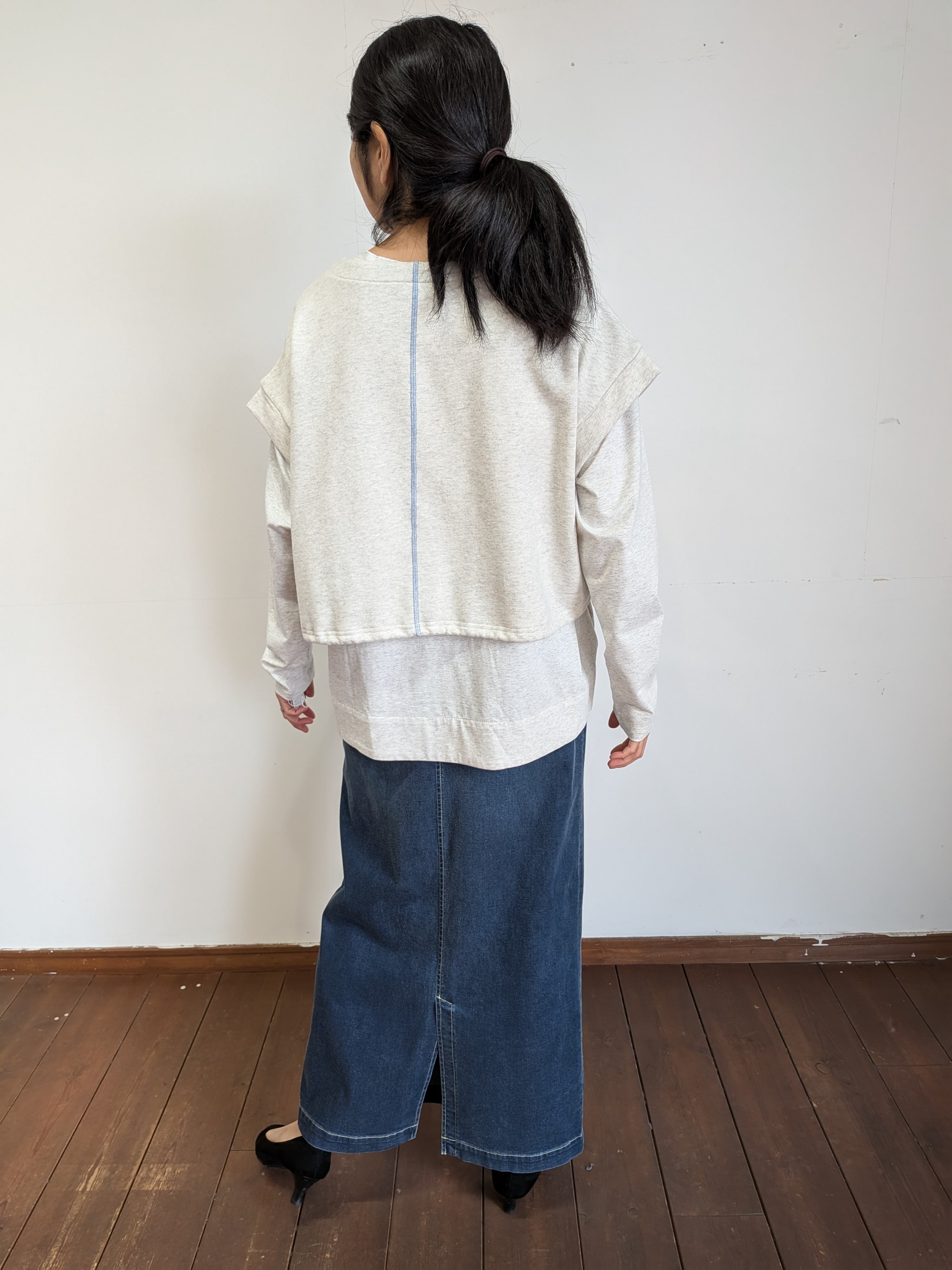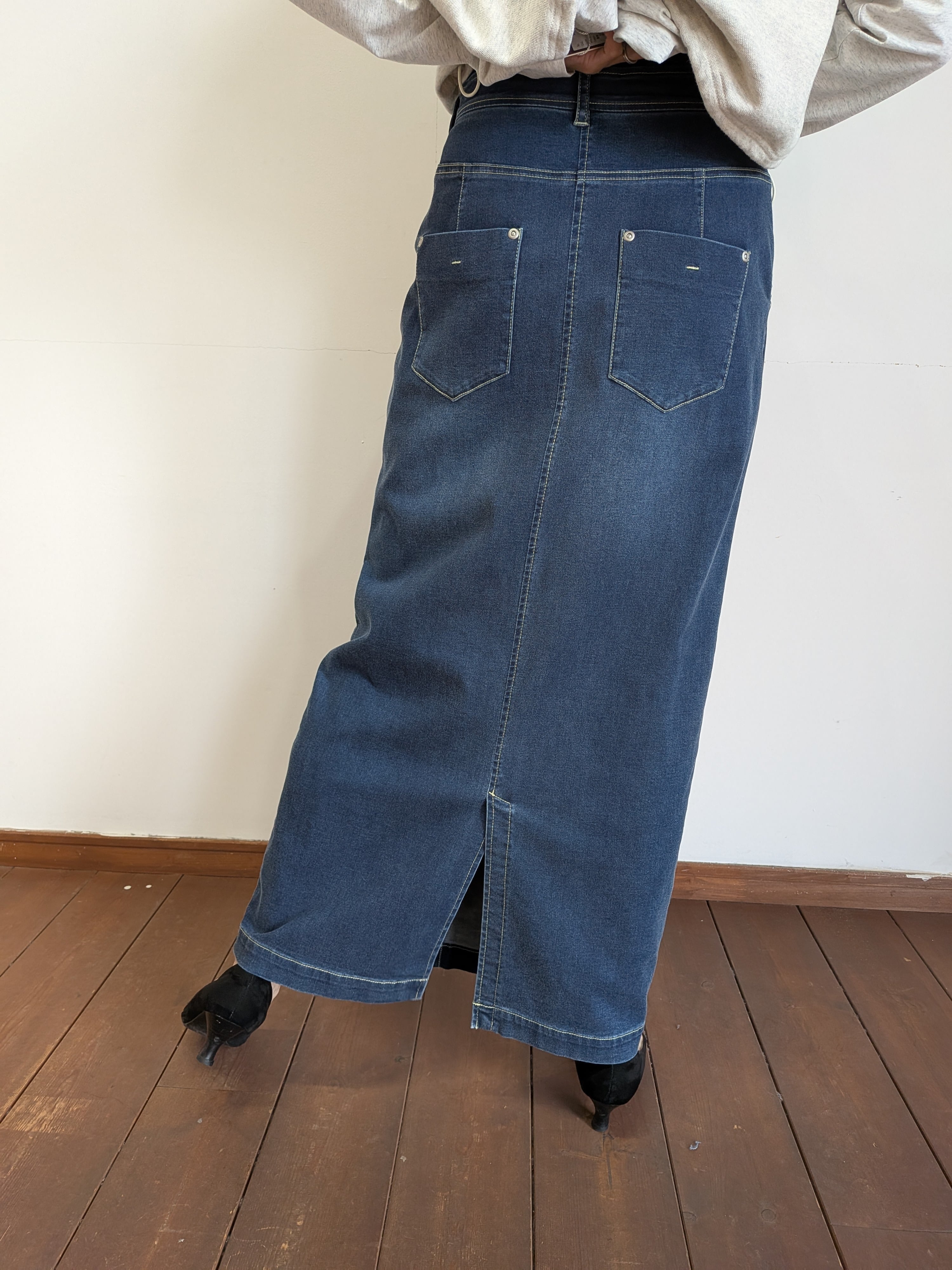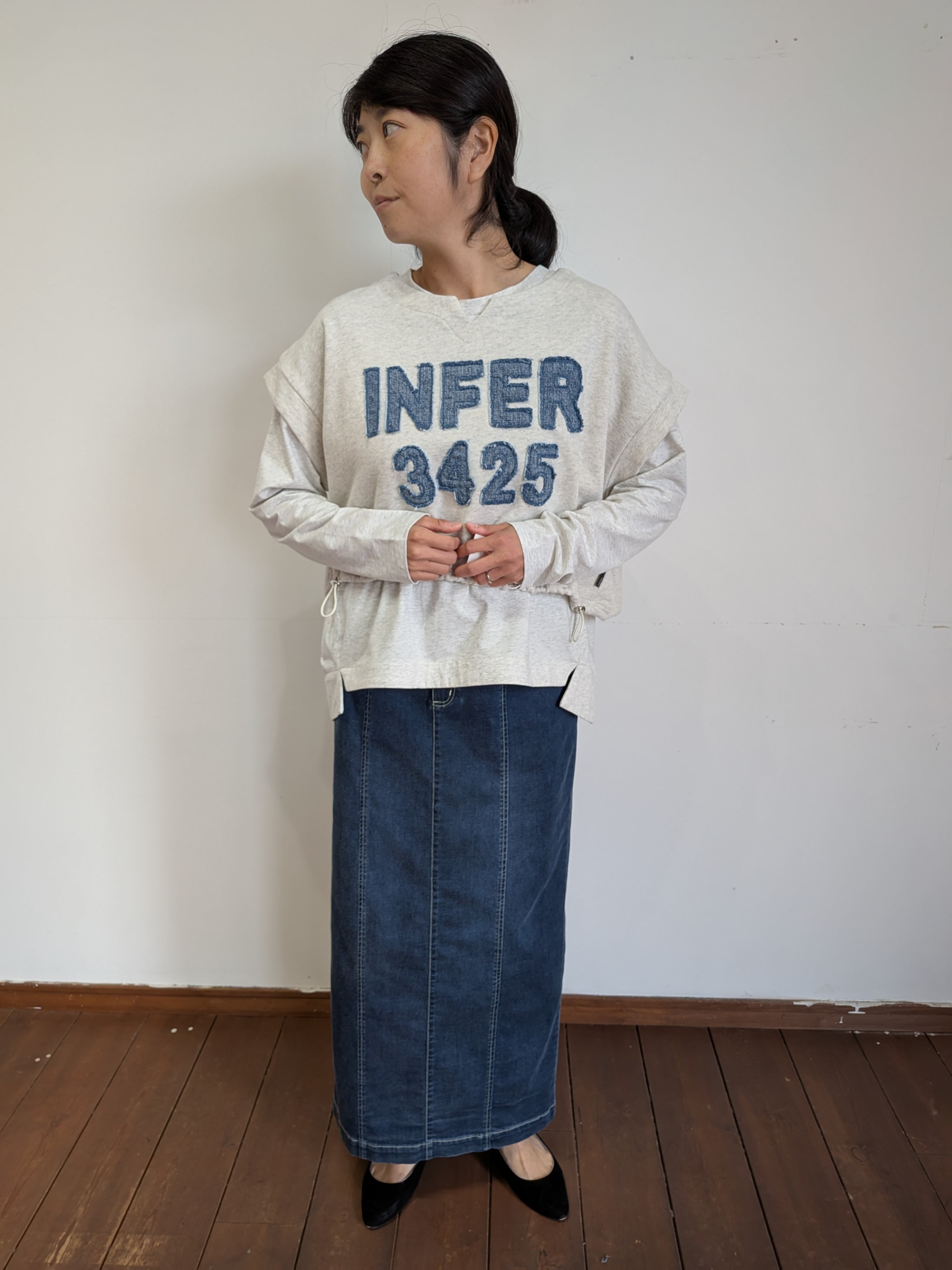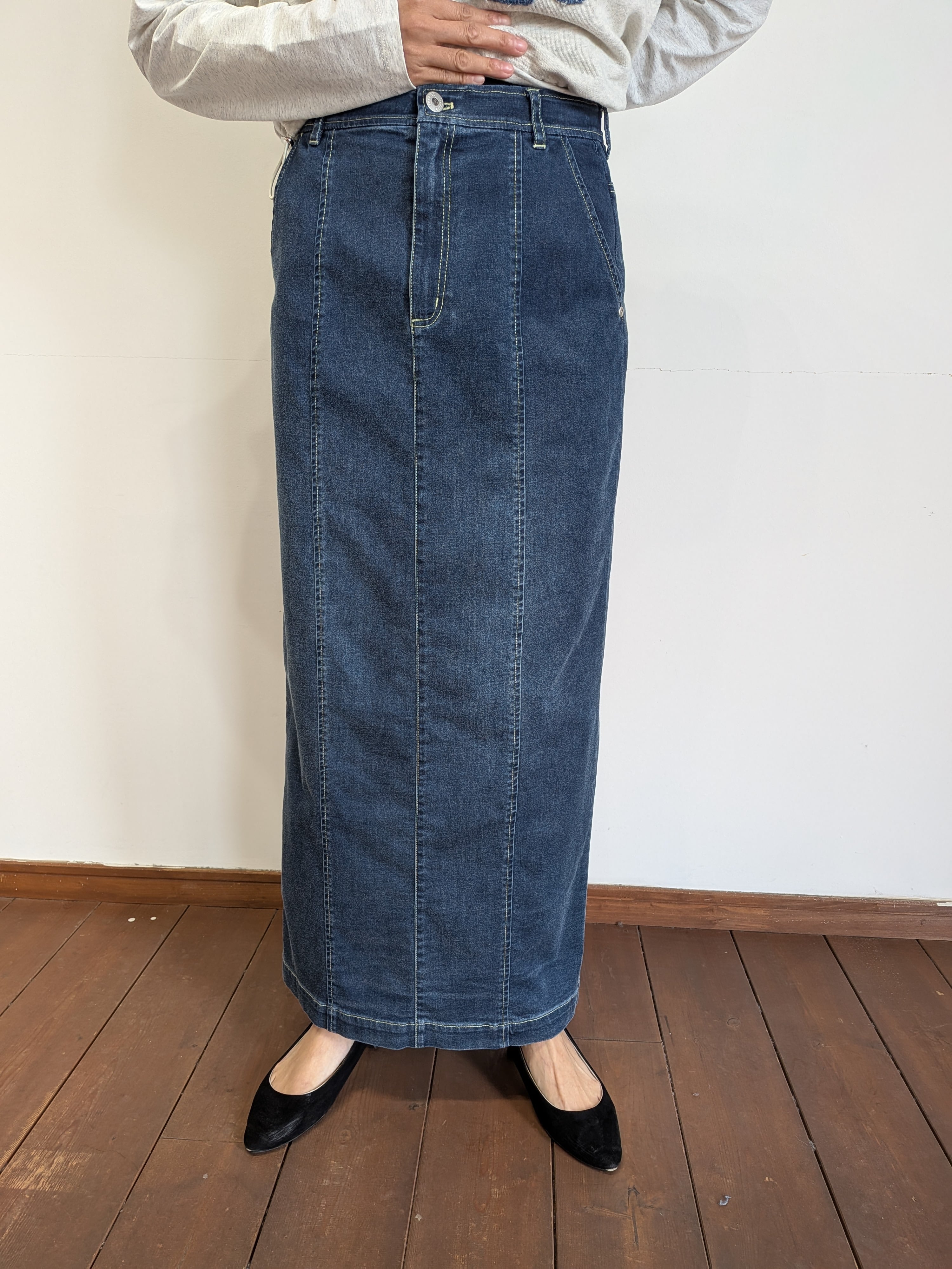 ayaneでは人気のダンガリーシリーズからストレッチダンガリーが初登場。非常に高いストレッチ性と肌触りの良さは、今までにない感覚のデニムですね。高いストレッチ性と柔らかさがペンシルスカートに適した素材です。どんなトップスも合わないものはないと言っても過言ではないスカートですのでおすすめです。