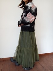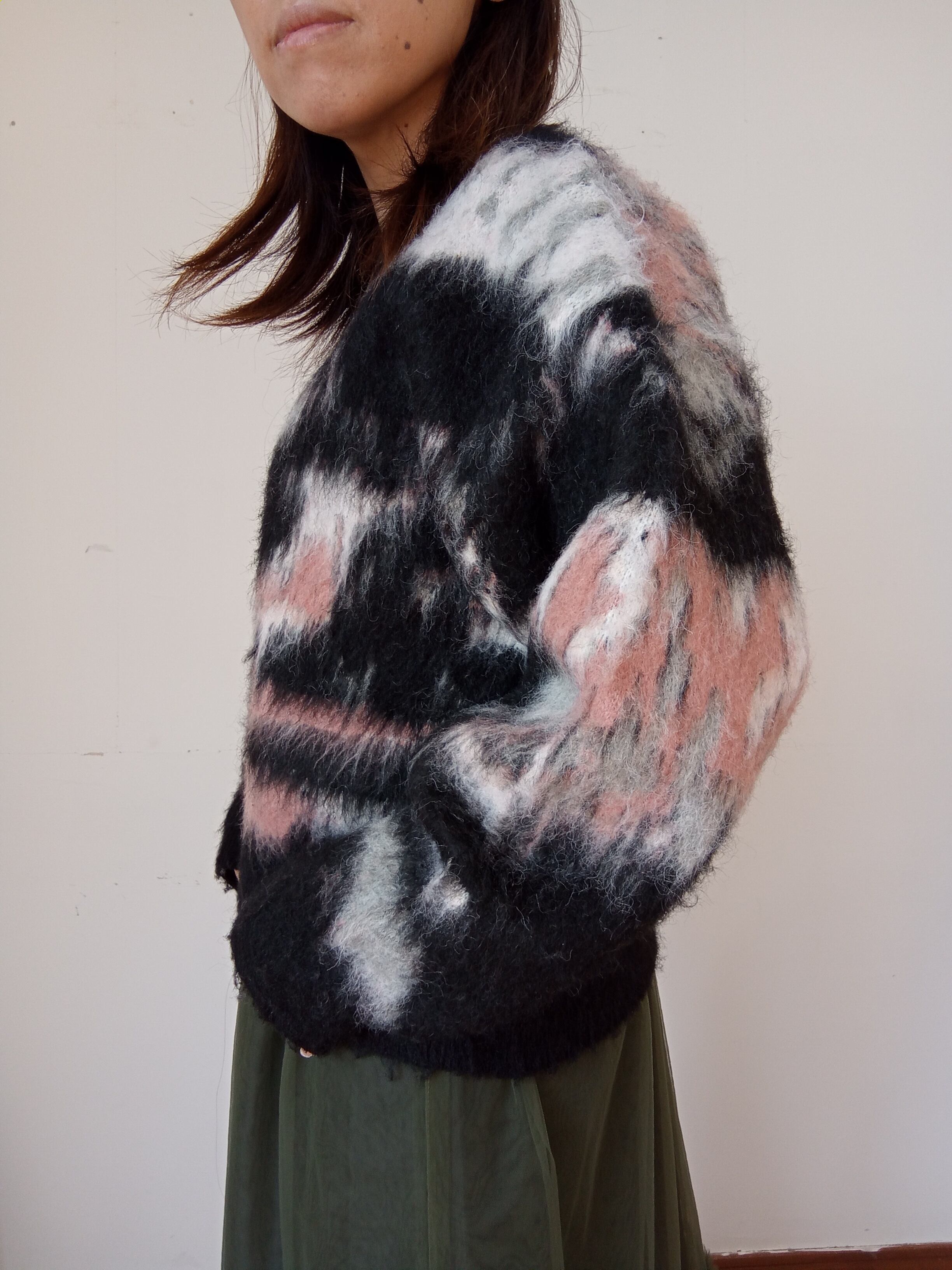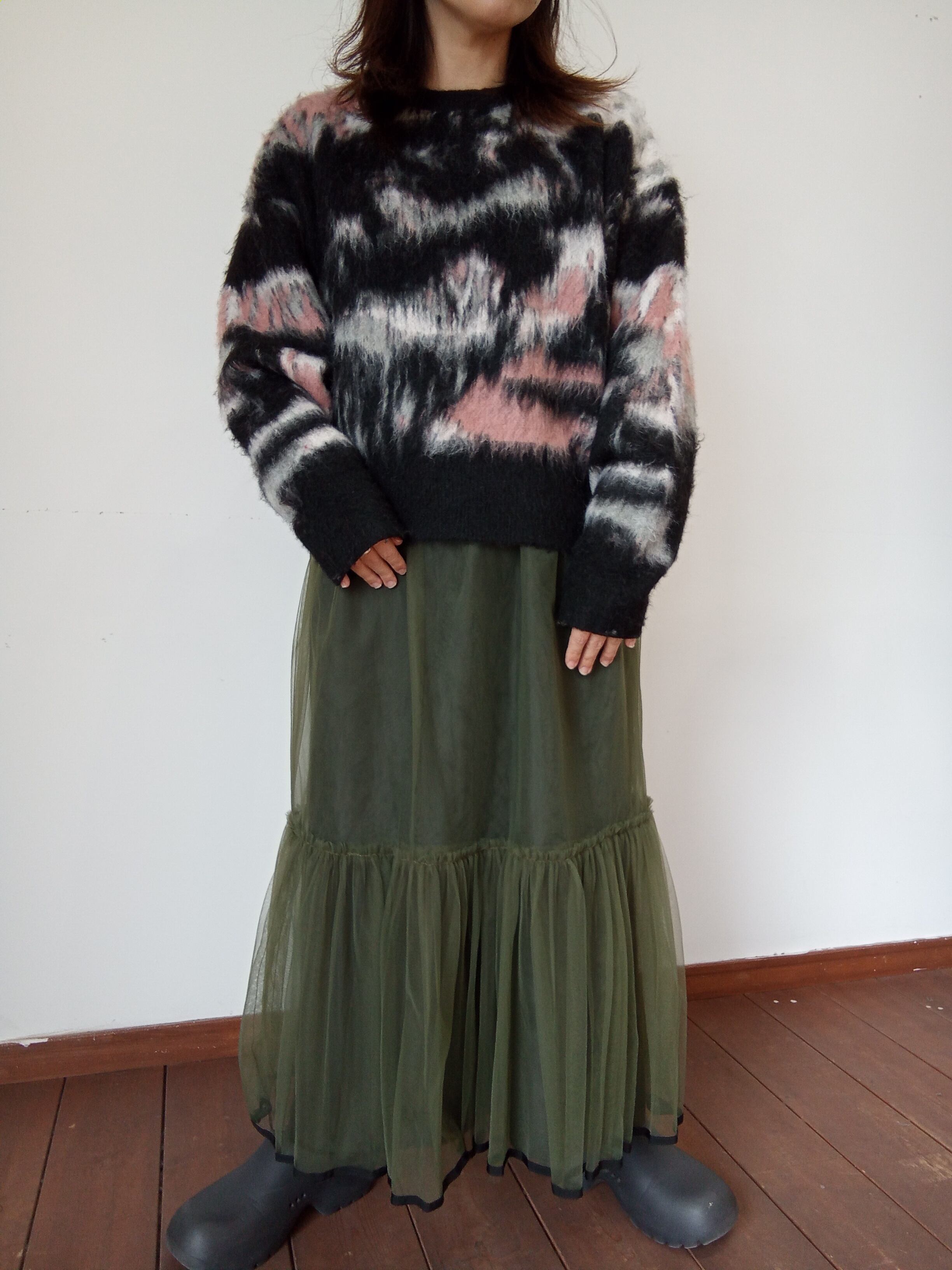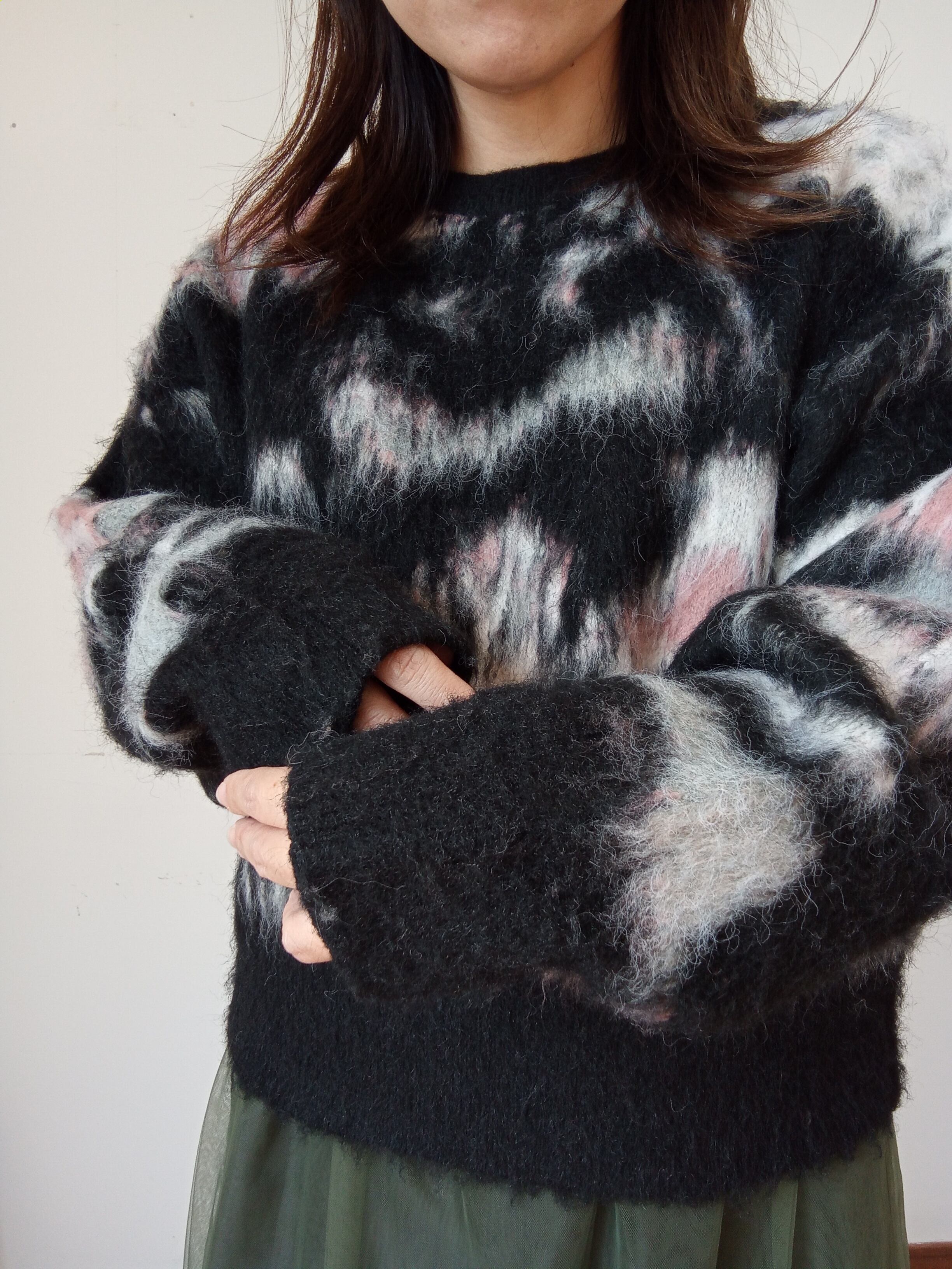 柄を主張しすぎないニュアンス柄のシャギープルオーバーニット。程よい厚みの編地で、軽く柔らかく暖かい素材感。柄も主張しすぎず、ゆるりとしたサイズも着やすい1枚です。