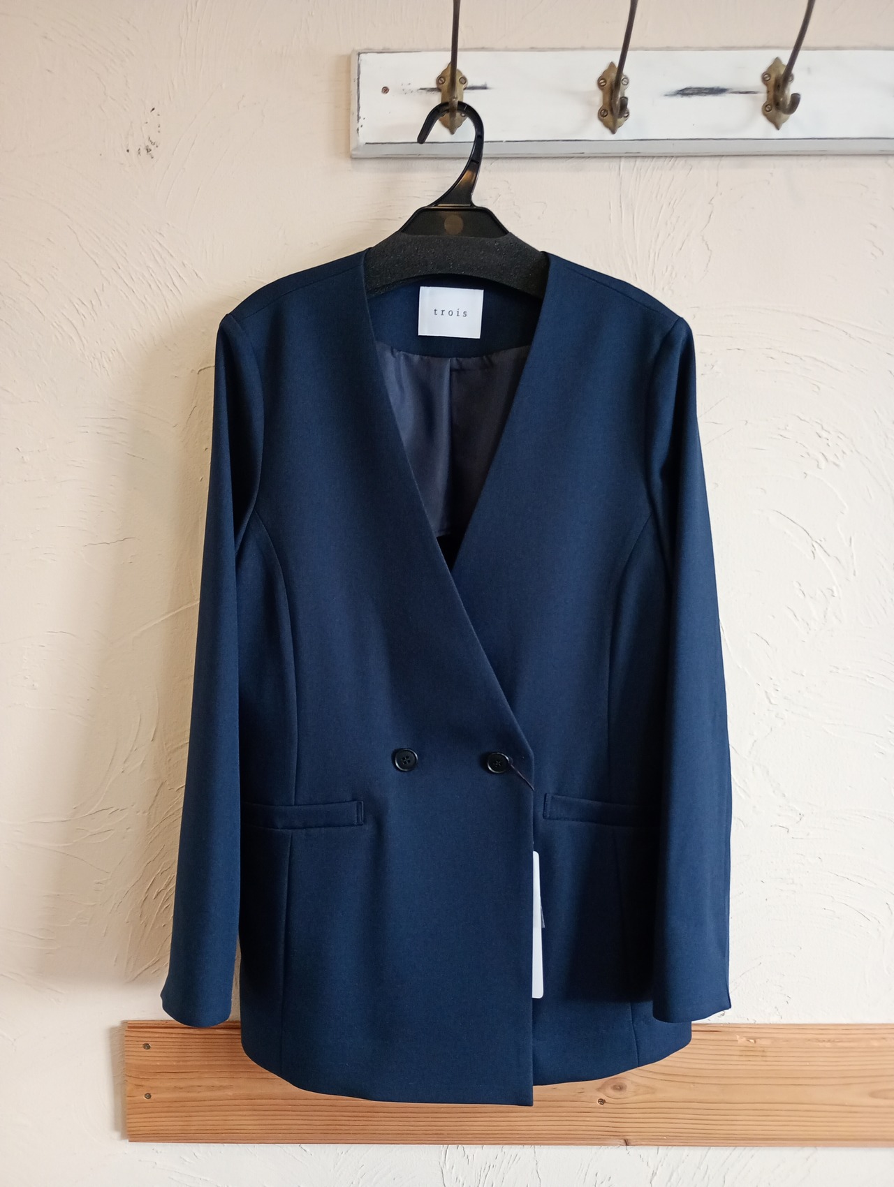 ソフィーツイルストレッチノーカラージャケット ネイビー trois