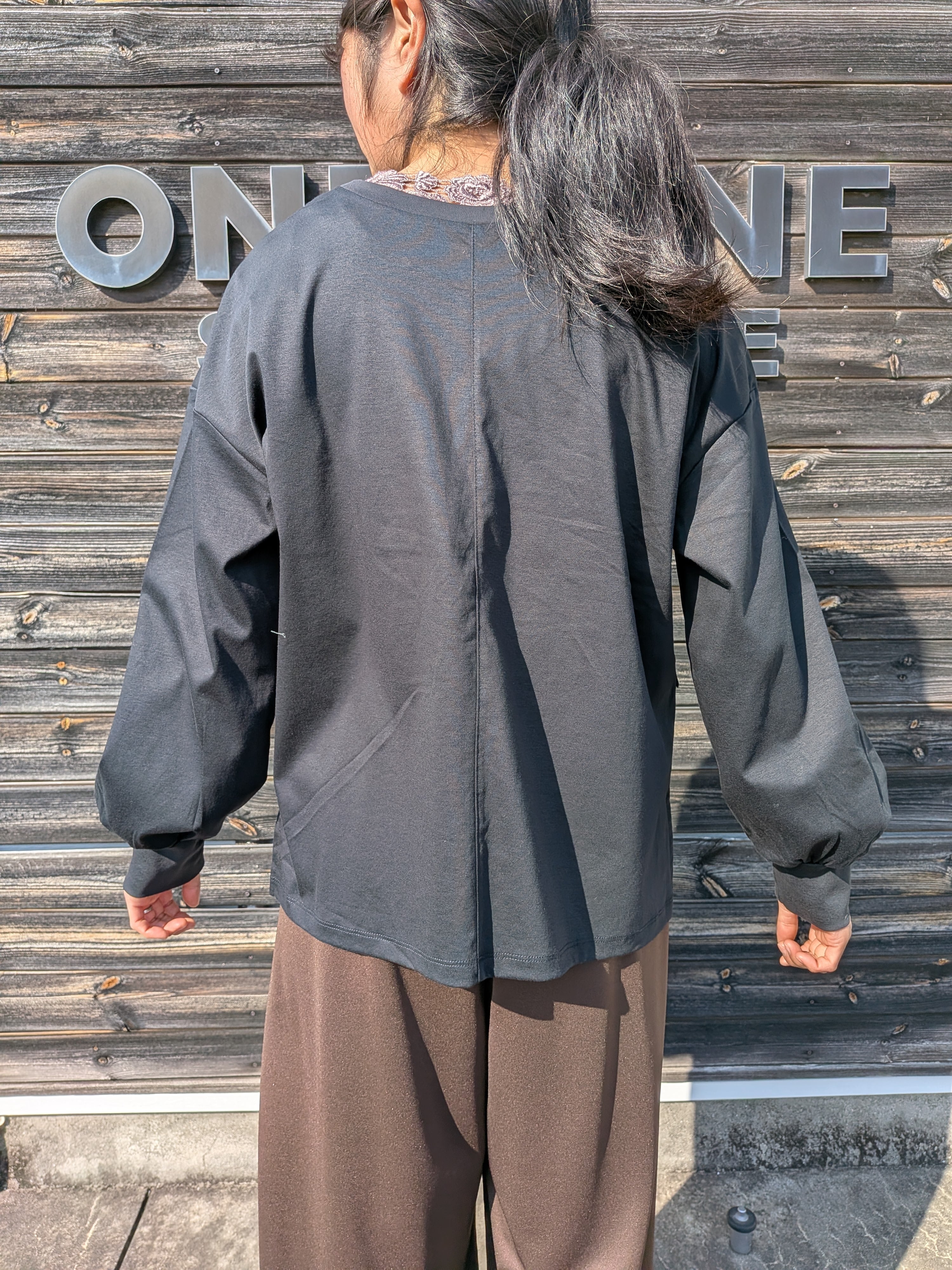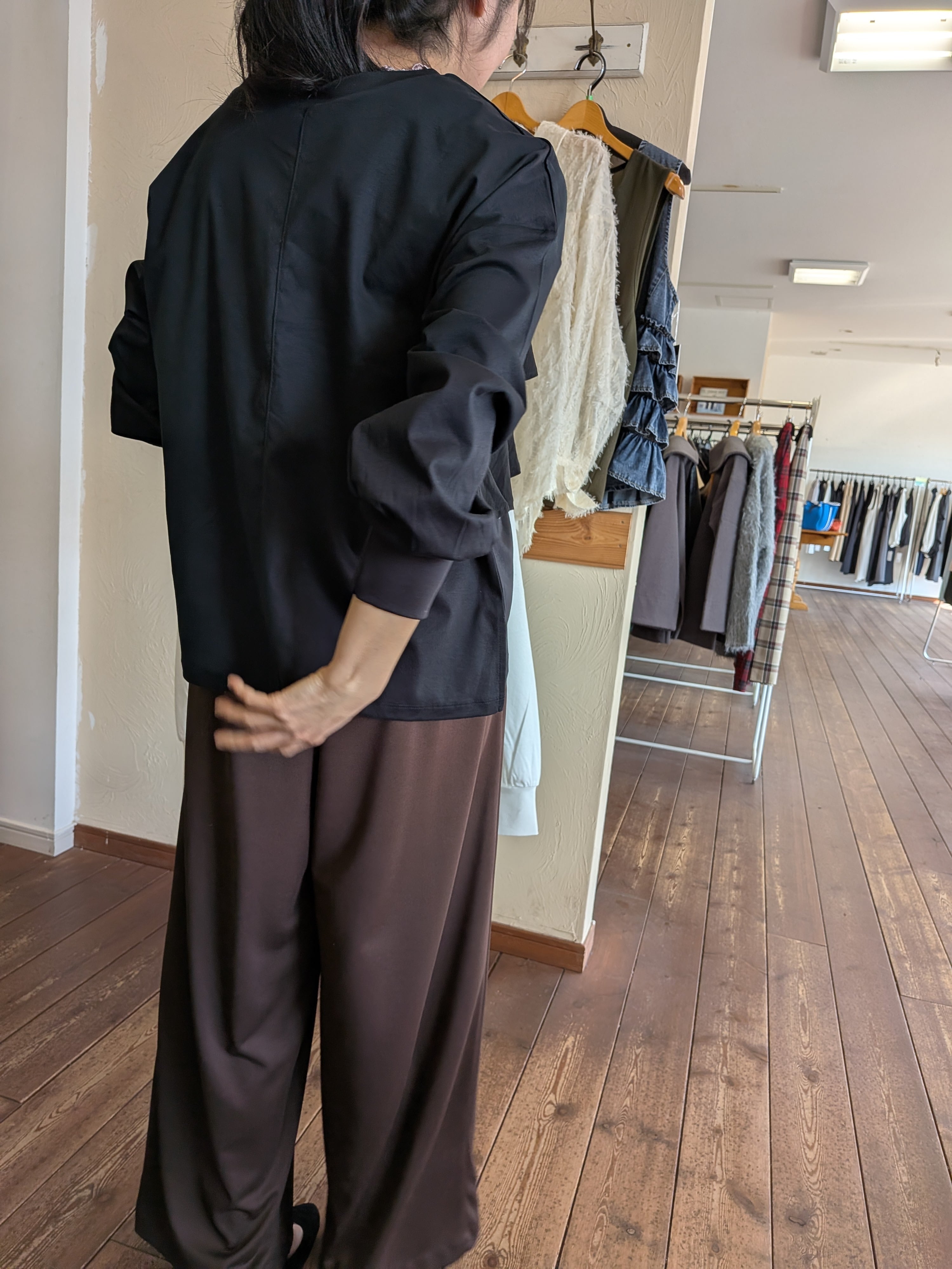 フロントに大胆に施したフリルがポイント。甘くなりすぎないようにナイロン系の別布布帛をドッキングし、甘さを中和しています。袖口はきれいにみせつつもたくし上げやすいように内側のみシャーリングゴムを叩いているので、袖もしっかりたくし上げることができます。