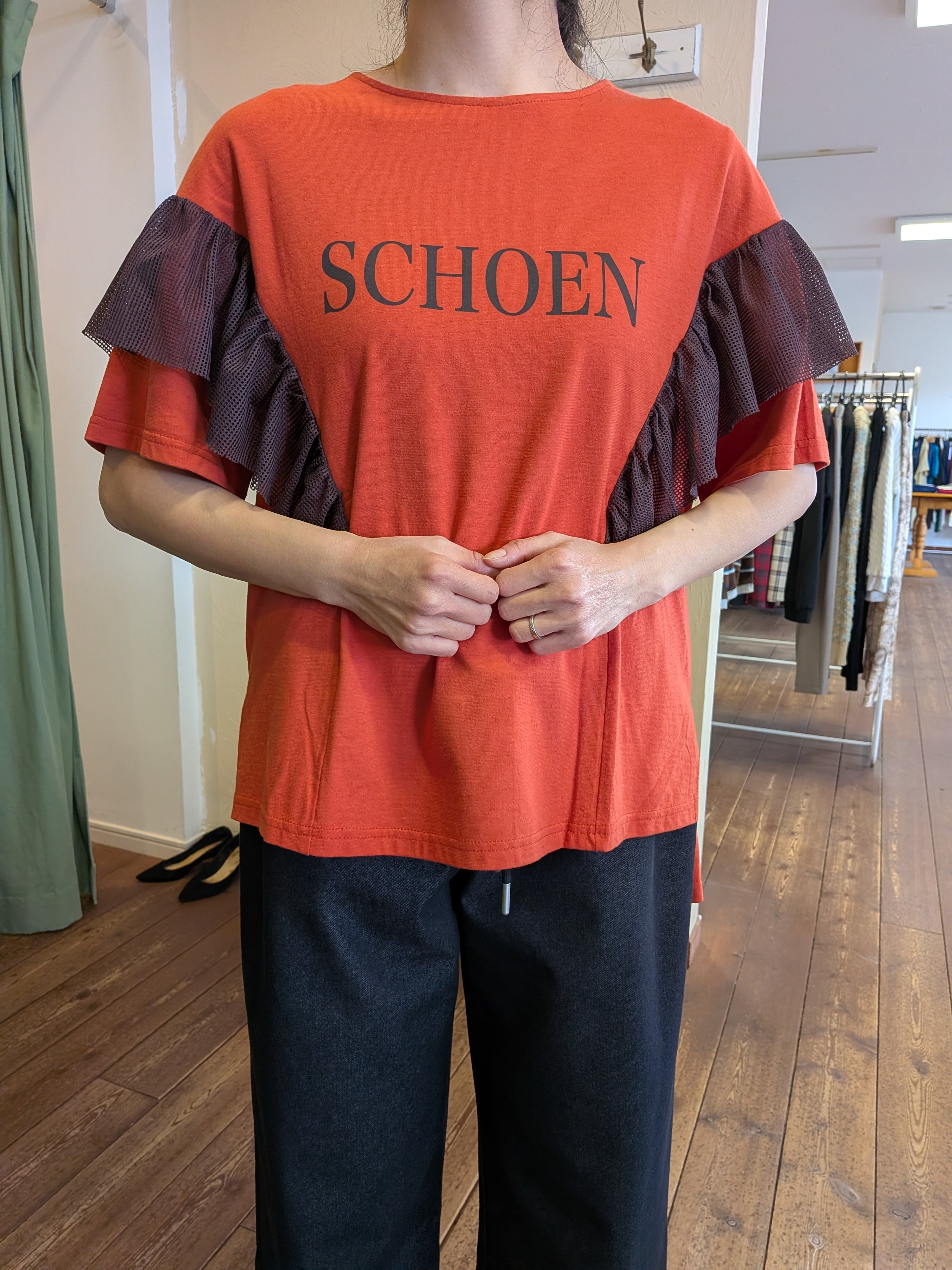 天竺×メッシュロゴプリントフリルプルオーバー テラコッタ trois